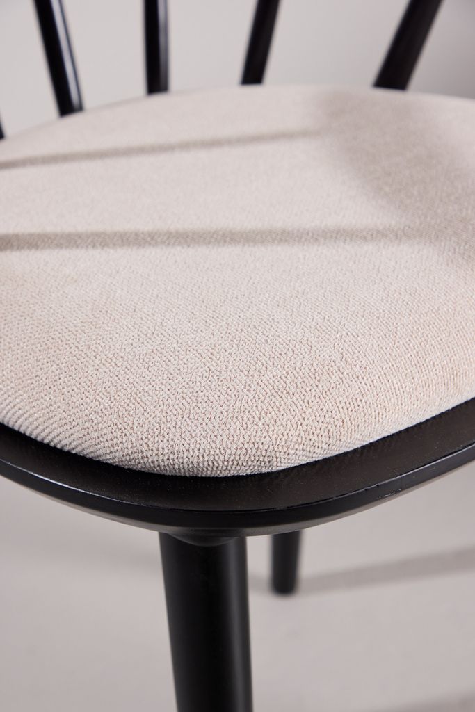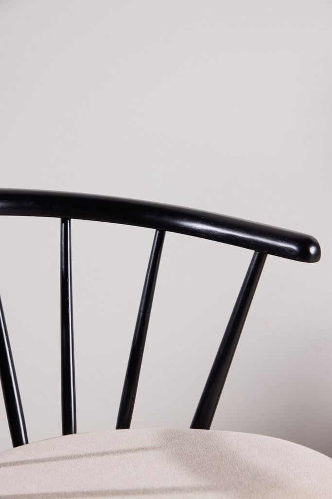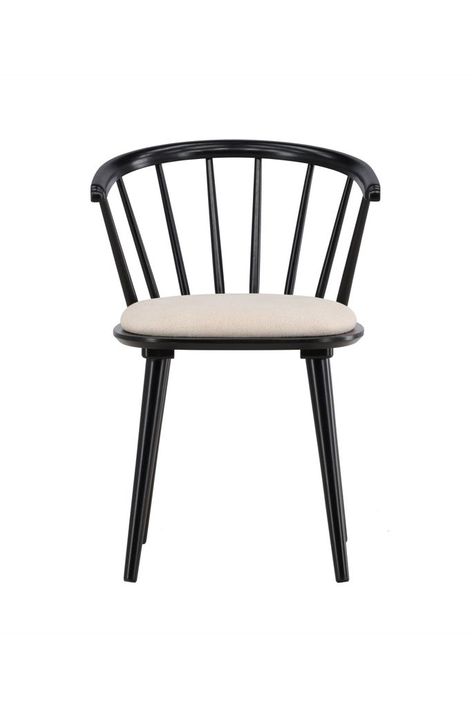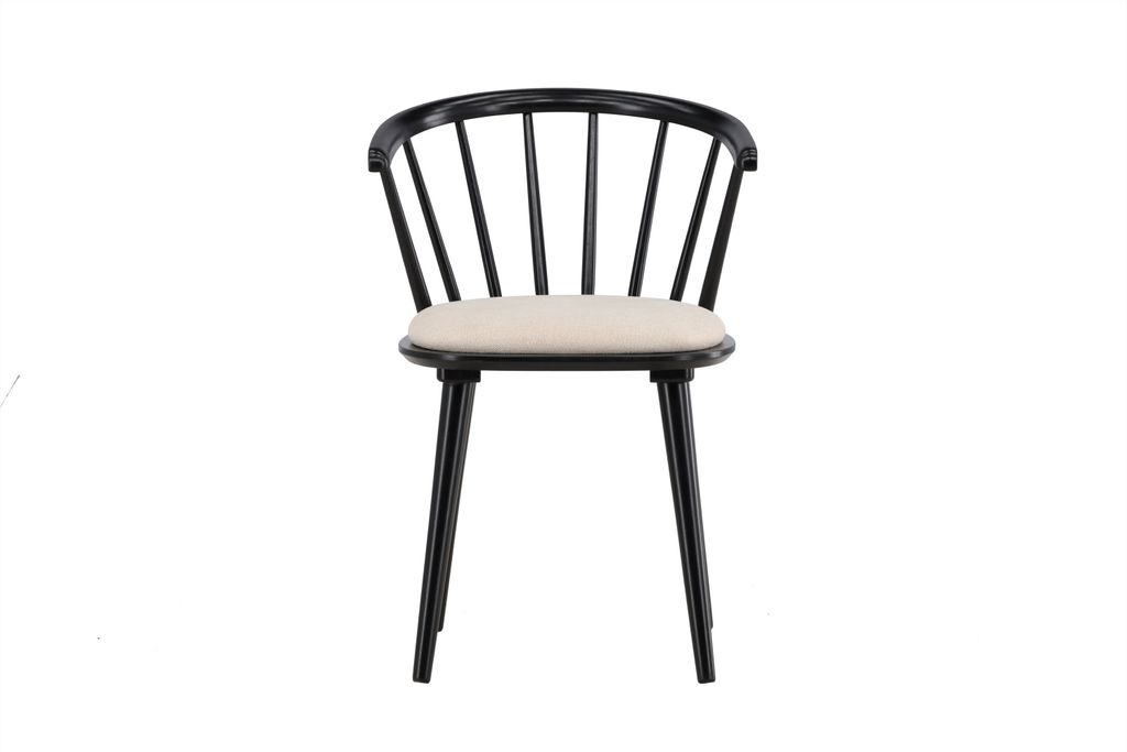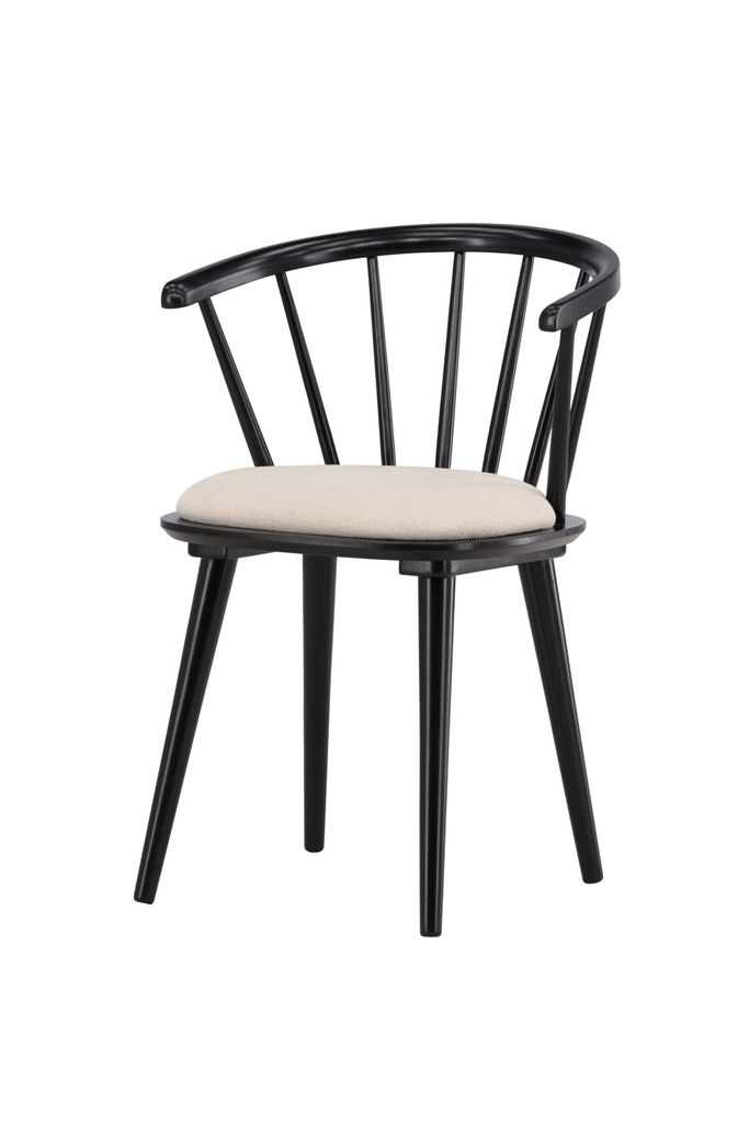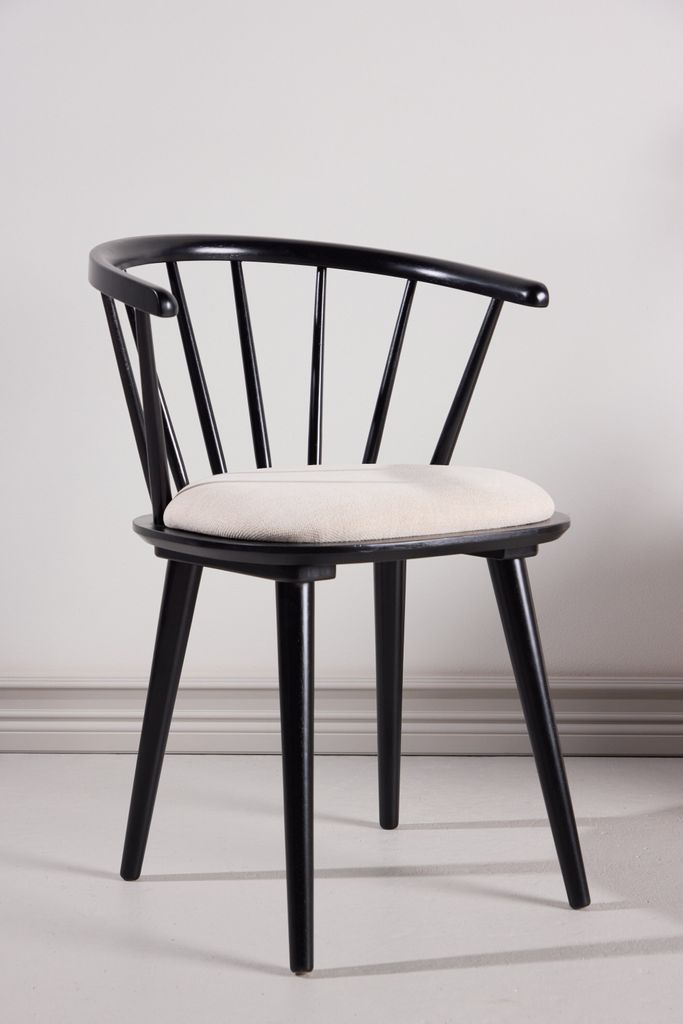 Elegant matstol i svart gummiträ med beige dyna för stil och komfort. Perfekt för matbord och som fristående stol.