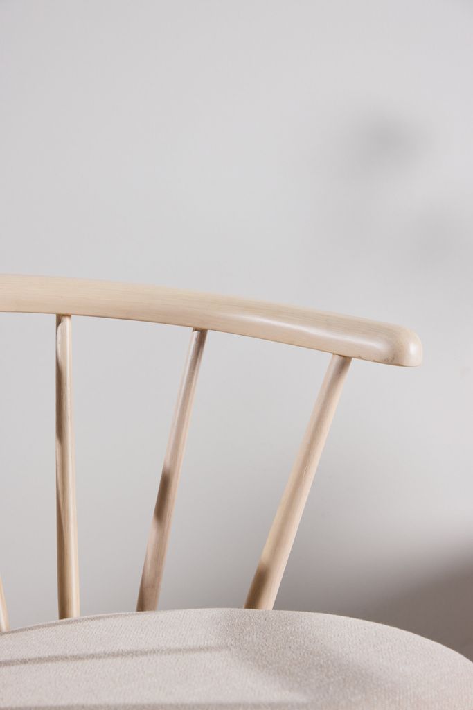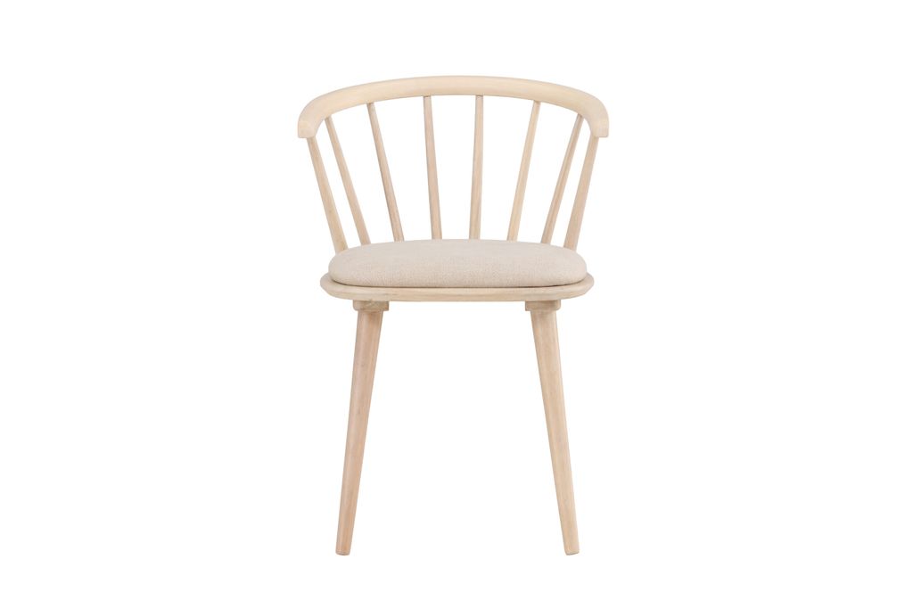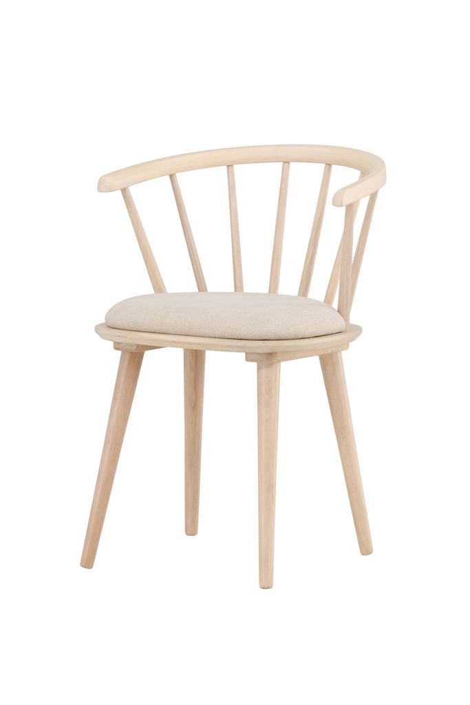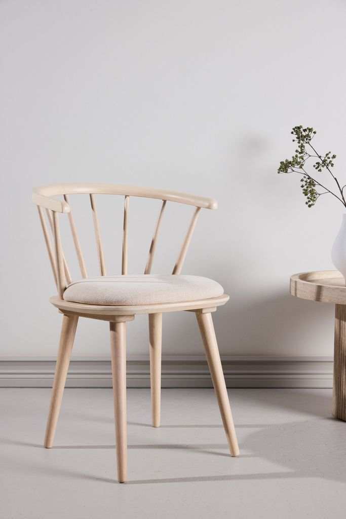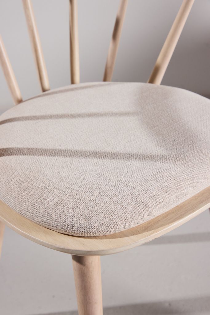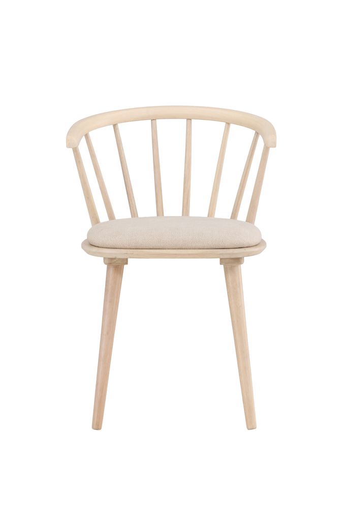 Den fastsydda beige dynan ger extra komfort och en mjuk kontrast mot det ljusa träet. De smala ryggpinnarna och den rundade ramen bidrar till stolens eleganta utseende. Den robusta konstruktionen säkerställer hållbarhet och långvarig användning.