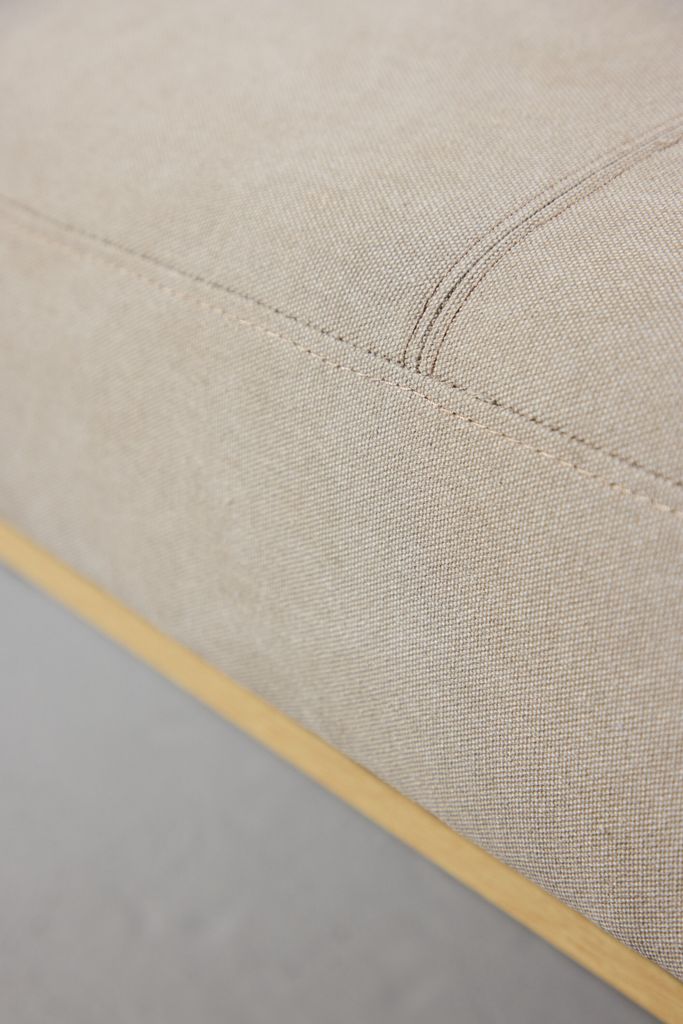 Den stilrena designen kompletteras med robusta ben i träfinish, vilket ger en modern men ändå tidlös känsla. De subtila sömmarna och den mjuka texturen hos linnetyget bidrar till en inbjudande atmosfär.