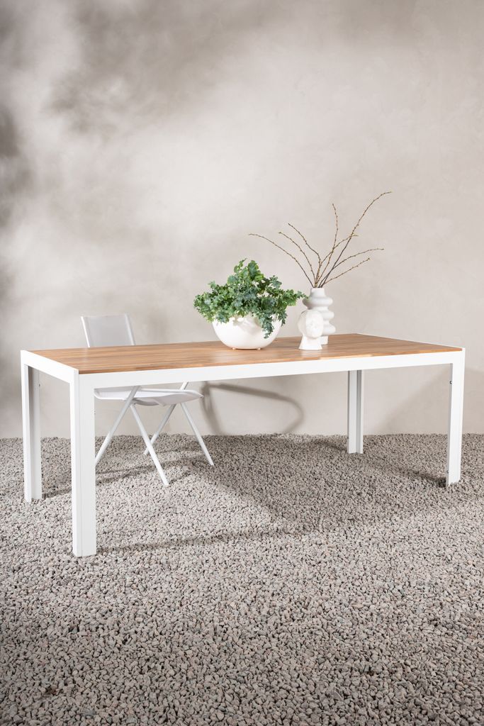 Matbord Bois kombinerar nordisk design med akacia och vit metall för stilfulla måltider utomhus.