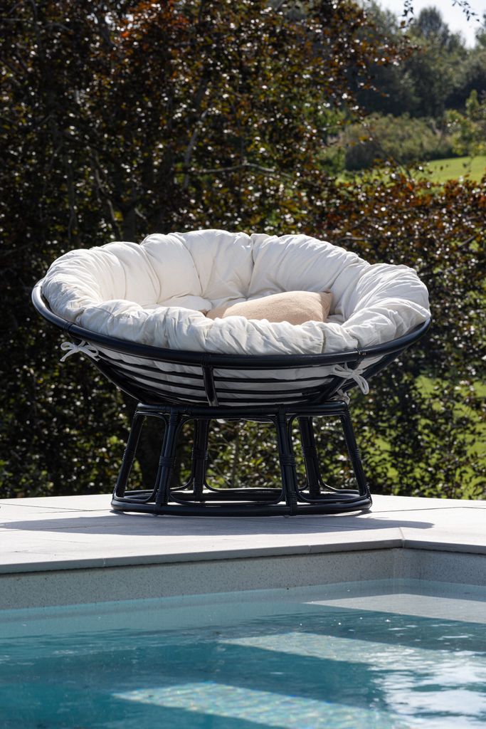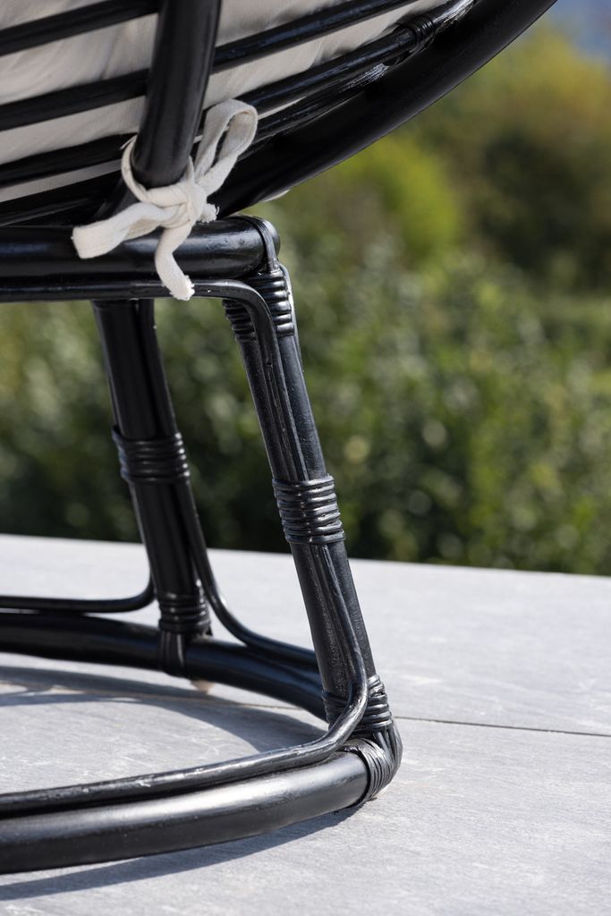 Stilren svart loungestol med offwhite dyna, perfekt för en modern utomhusmiljö.