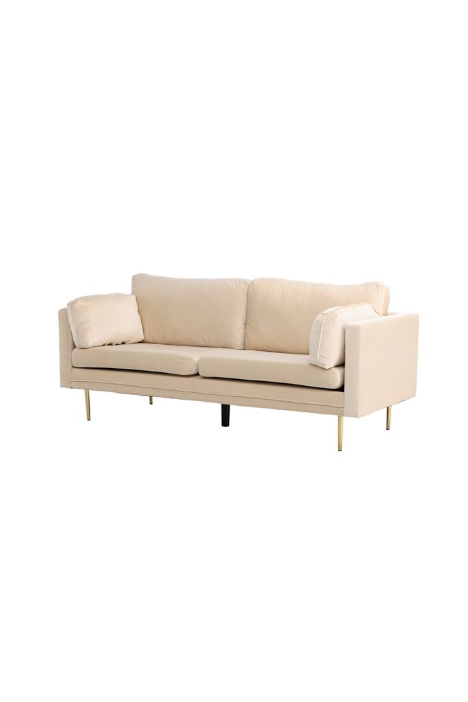 Elegant 3-sits soffa med krämfärgad sammetsklädsel och stilsäkra metallben. Perfekt för både komfort och stil.