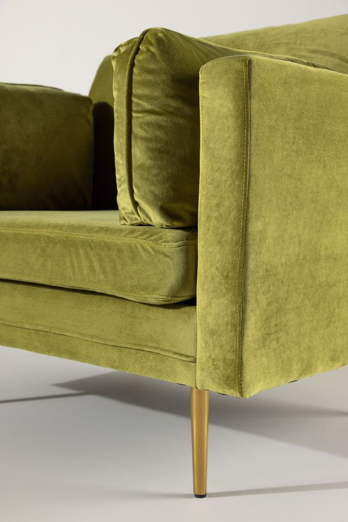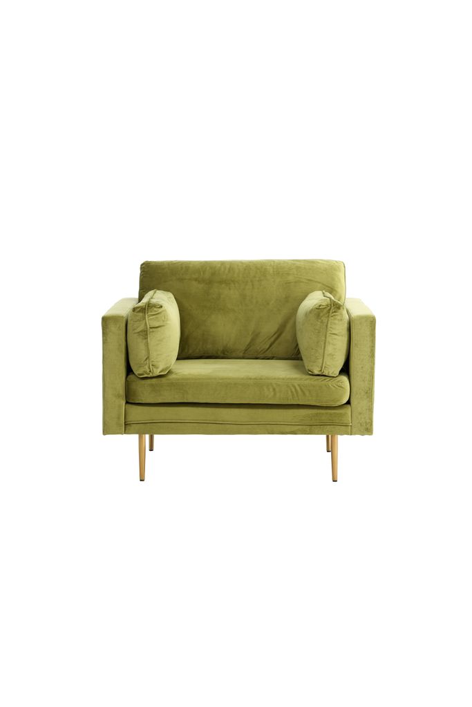 Boom-fåtöljen från Venture Home är en perfekt kombination av modern design och lyxig komfort. Med sitt lena gröna sammetstyg ger den en elegant och inbjudande atmosfär i vilket rum som helst. Den raka men mjuka designen tillsammans med de smala höga guldfärgade benen skapar en luftig känsla, vilket gör den idealisk för såväl centrala placeringar som hörnor.