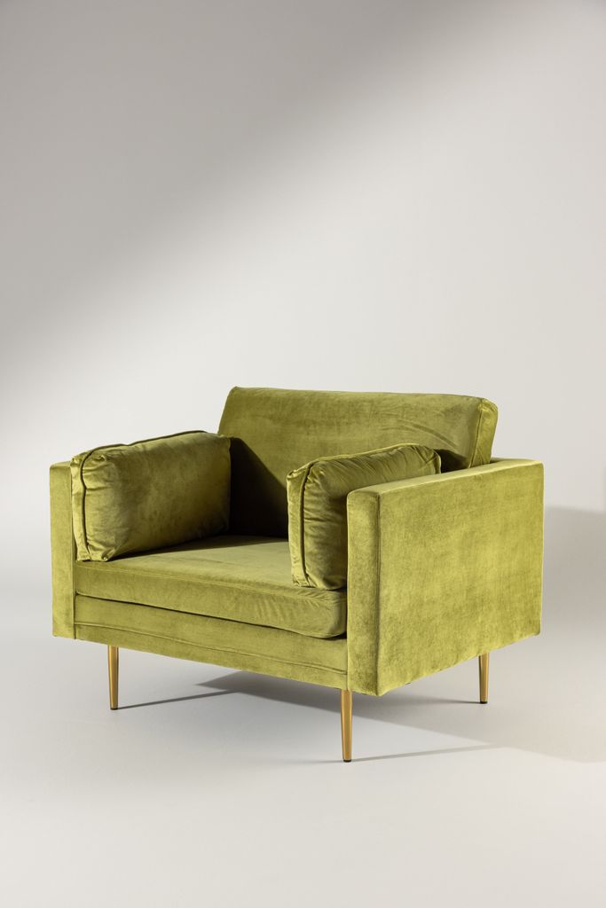 Boom-fåtöljen kombinerar stilren design med hög komfort, klädd i lent grönt sammetstyg och eleganta guldfärgade ben.