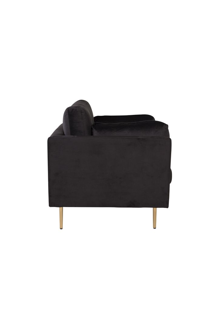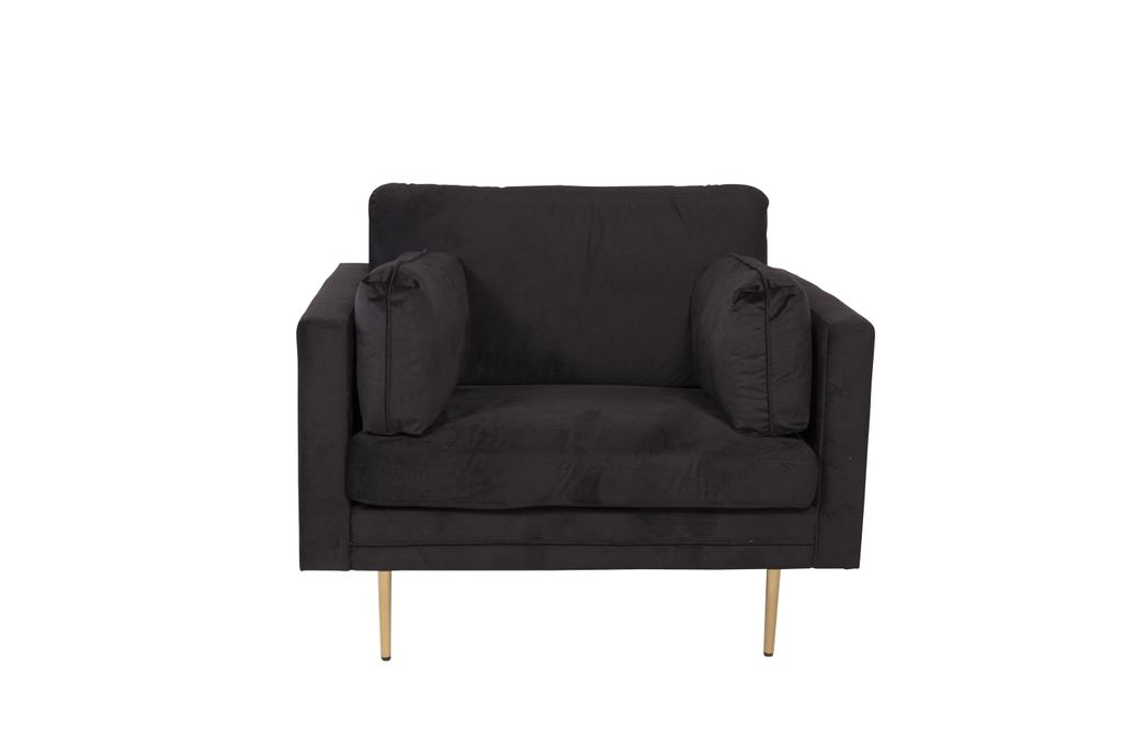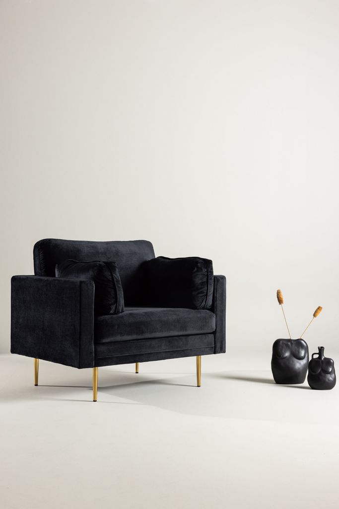 Boom är en modern fåtölj i svart sammet med hög komfort och stilren design, perfekt för vardagsrummet.