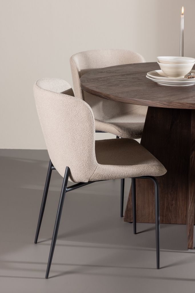 De fyra Modesto-stolarna kompletterar bordet perfekt med sina eleganta sitsar klädda i vit boucle och stilrena svarta ben. Dessa stolar erbjuder både komfort och stil, vilket gör dem idealiska för långa, njutbara middagar med familj och vänner. Deras moderna design med hög ryggstöd och mjuka sitsar ger ditt matrum en sofistikerad och samtida touch.