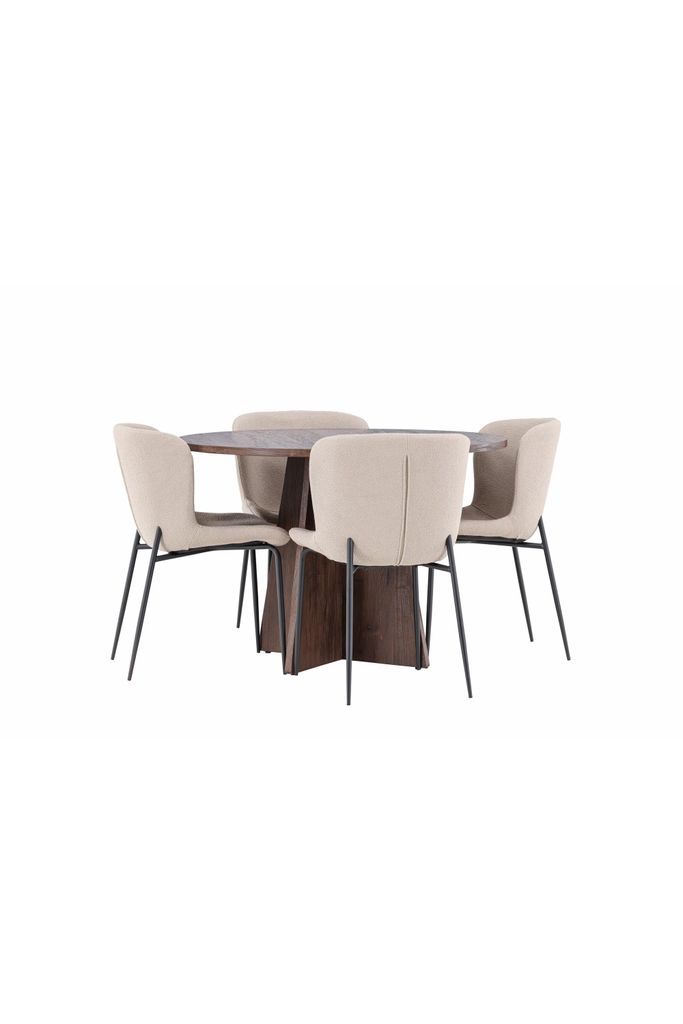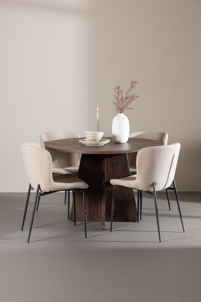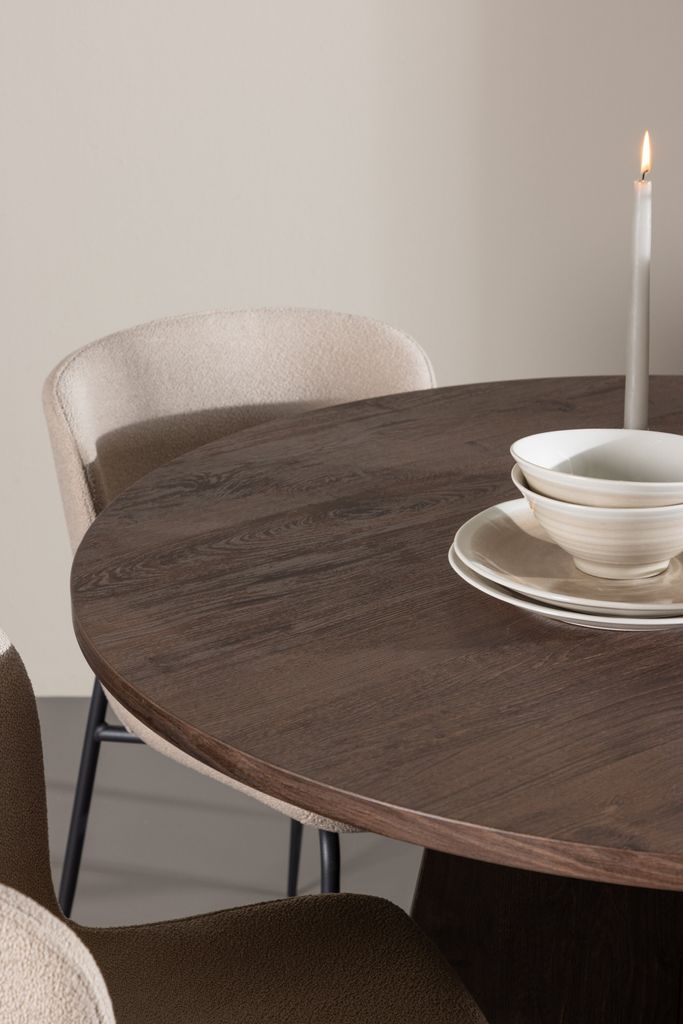 Elegant matgrupp med moccafärgat bord och komfortabla Modesto-stolar i vit boucle, perfekt för både vardag och fest.