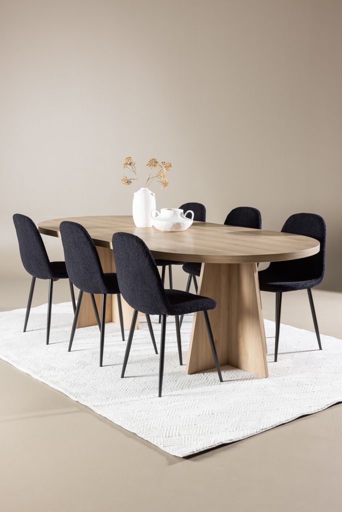 Elegant matgrupp med modernt matbord och bekväma stolar i svart polyester teddy, perfekt för sociala sammankomster.