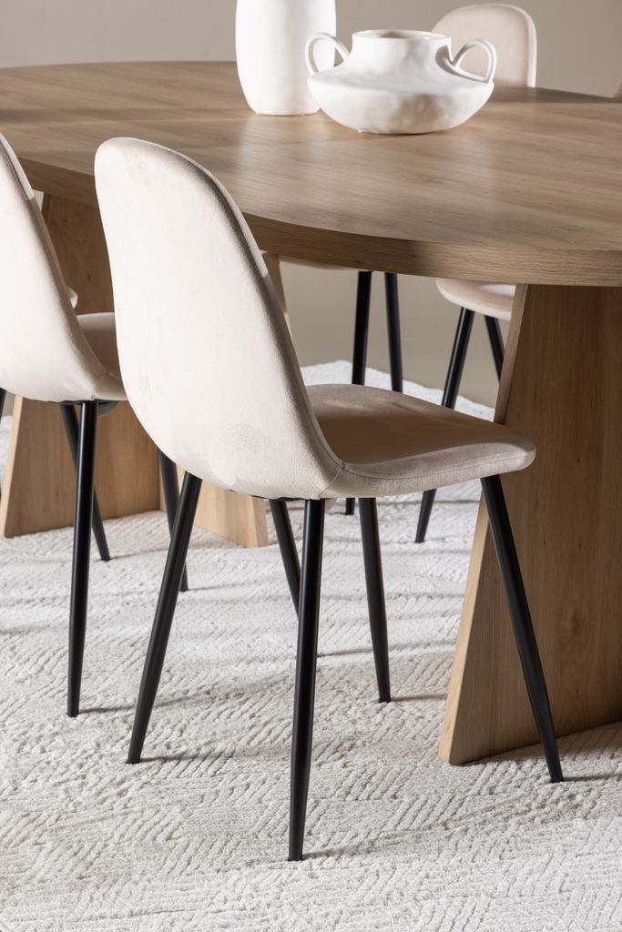 Förvandla ditt hem med stil och funktionalitet med Bootcut matbord och Polar matstol i elegant beige sammet.