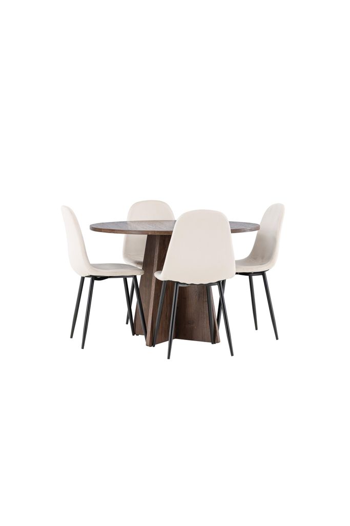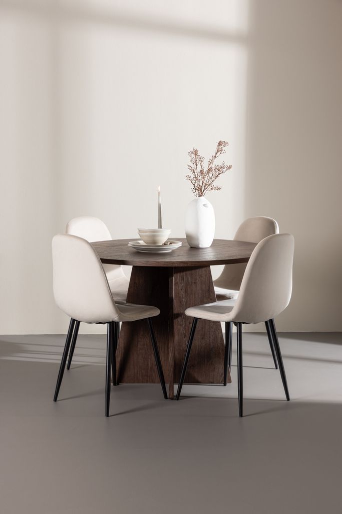 Förvandla ditt matrum med vår eleganta matgrupp. Bootcut-bord i mocca och mjuka Polar-stolar i beige sammet för stil och komfort.