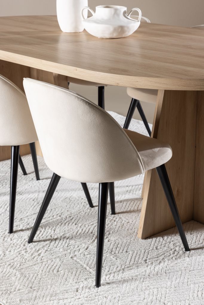 Den beige Velvet matstolen har en helklädd design i mjukt sammetstyg med lätt rundad rygg och sits, vilket erbjuder både komfort och stil. Stolen står stadigt på ben av svart pulverlackerad metall, vilket ger en modern kontrast mot det mjuka tyget.