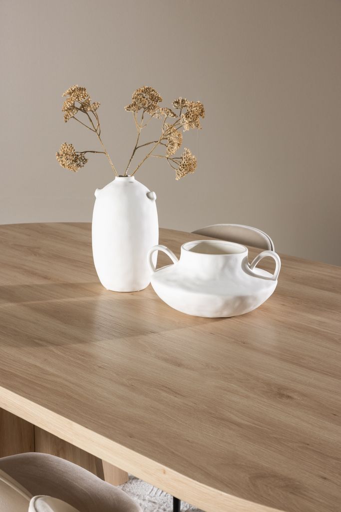 Bootcut matbordet imponerar med sina generösa mått på 230x115 cm, vilket ger gott om plats för sällskapliga middagar och långa samtal. Det är tillverkat i en förtjusande vittvättad färg som bidrar med en jordnära känsla och kompletteras av en skandinavisk design med rena linjer.