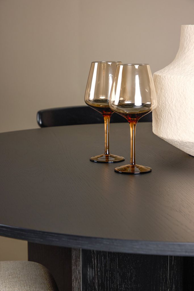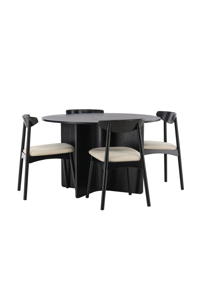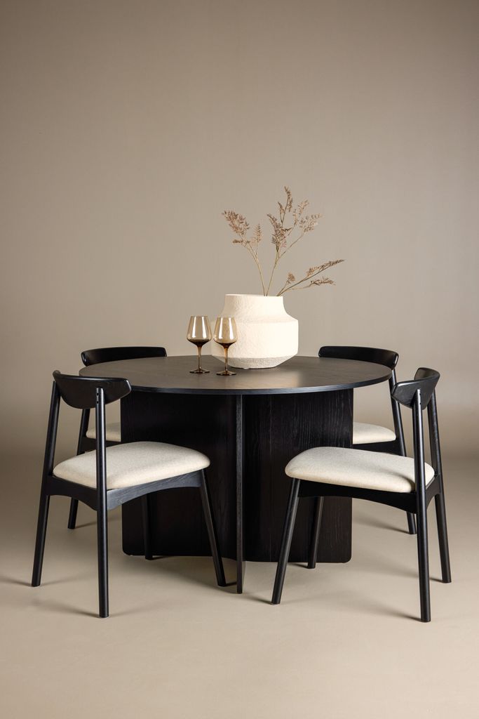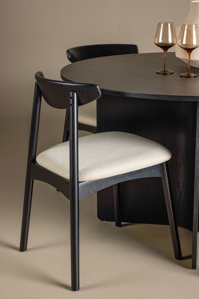 Runt bordet står de stilfulla Ven-stolarna, vars svarta ramar harmoniserar med bordet. De beige dynorna tillför en varm och mjuk kontrast, vilket skapar en balanserad helhet där färg och form samspelar på ett smakfullt sätt.