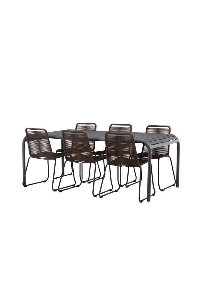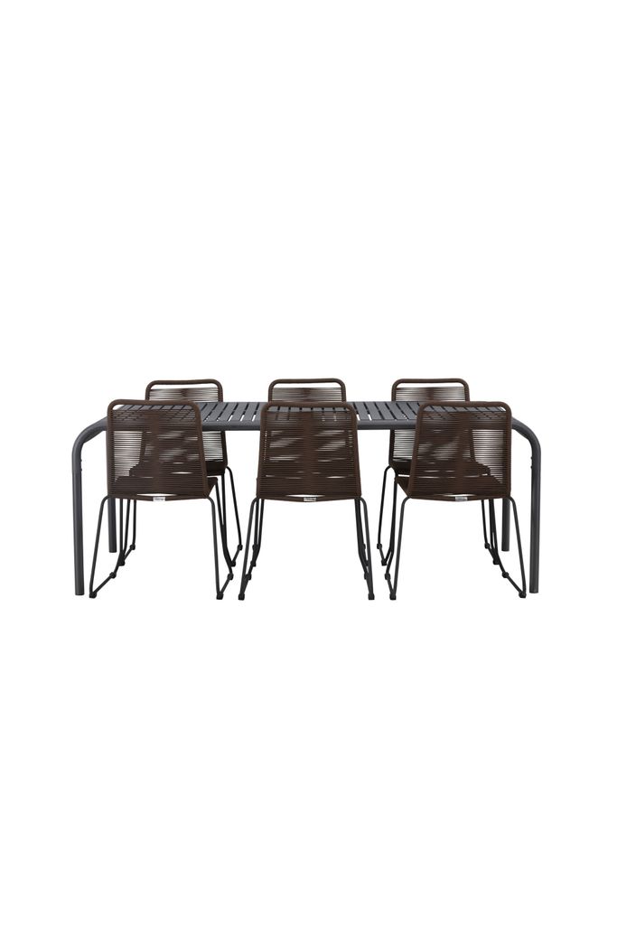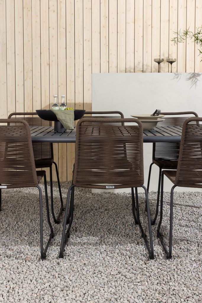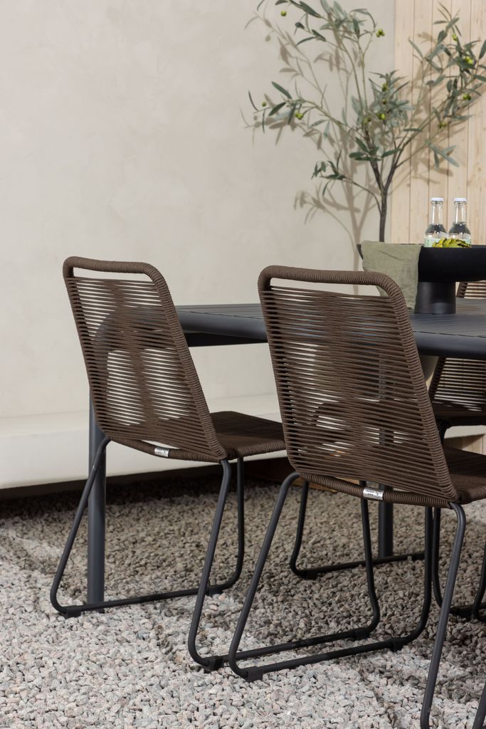Denna matgrupp inkluderar stolar från serien Lindos, som har en trendig design med sits i brunt rep och en ramkonstruktion i robust svart stål. Den kontrasterande kombinationen av material och färger ger en modern känsla som passar perfekt på alla uteplatser.
