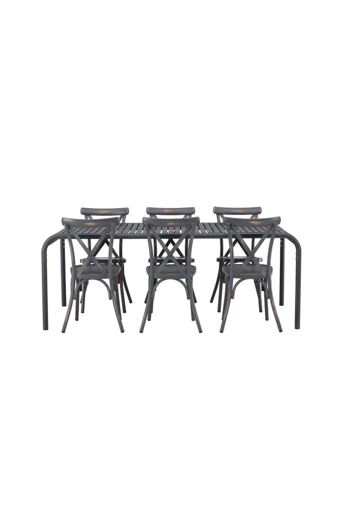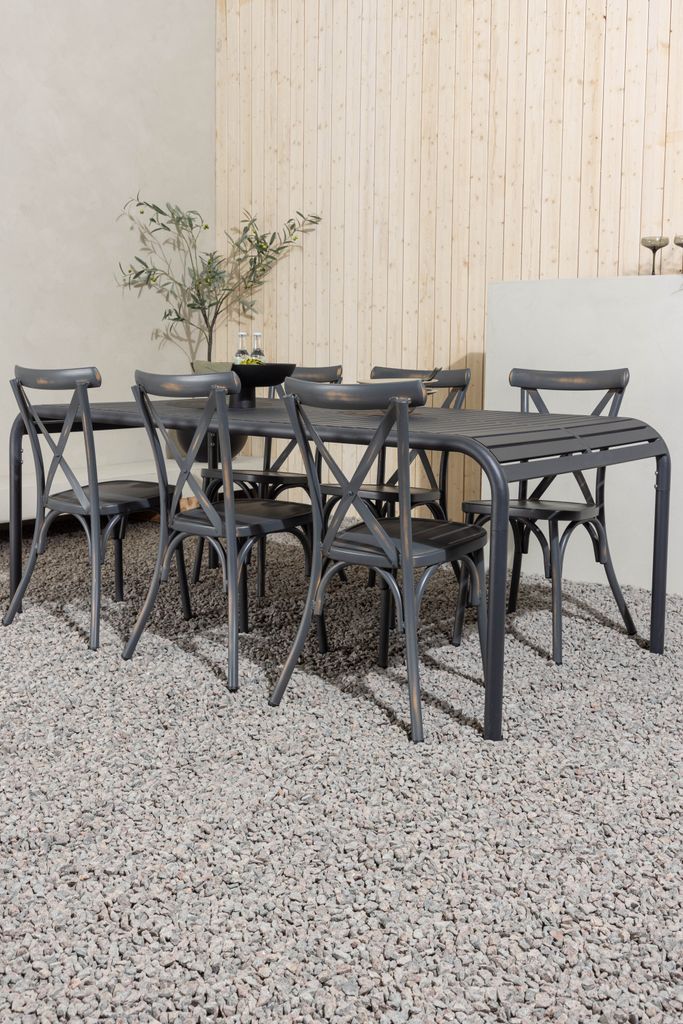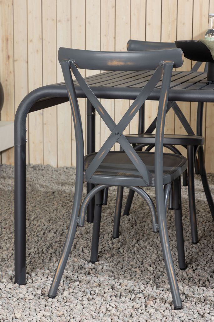 De medföljande Tablas-stolarna har en modern, industriell stil med korsdetaljer på ryggstödet, vilket förstärker matgruppens visuella intryck. Stolarnas sotiga svarta färg harmoniserar perfekt med bordet, vilket skapar ett enhetligt och inbjudande utseende.