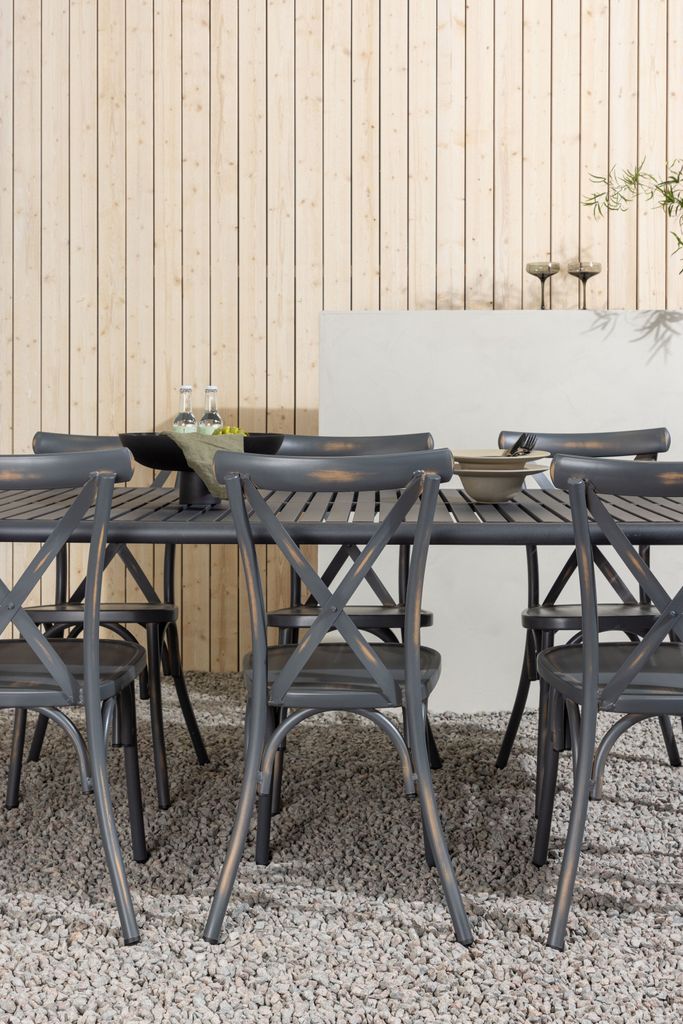 Elegant matgrupp i svart aluminium för uterummet. Slitstarkt, industriell design med moderna Tablas-stolar.
