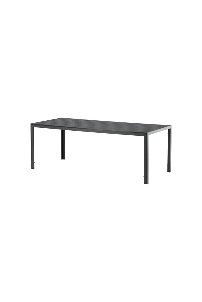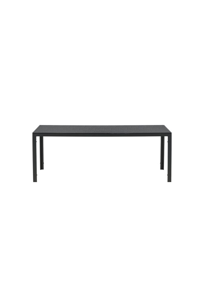Smart och stilrent rektangulärt matbord i svart polywood och aluminium, perfekt för utelivs njutning.