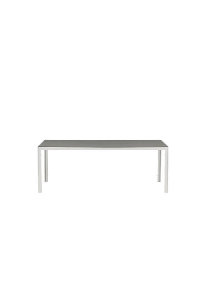 Elegant och hållbart rektangulärt bord i nordisk design med grå polywood och vita aluminiumben. Perfekt för utomhusmåltider.