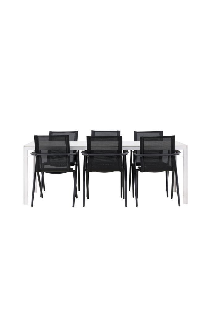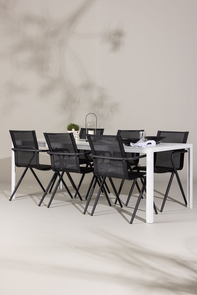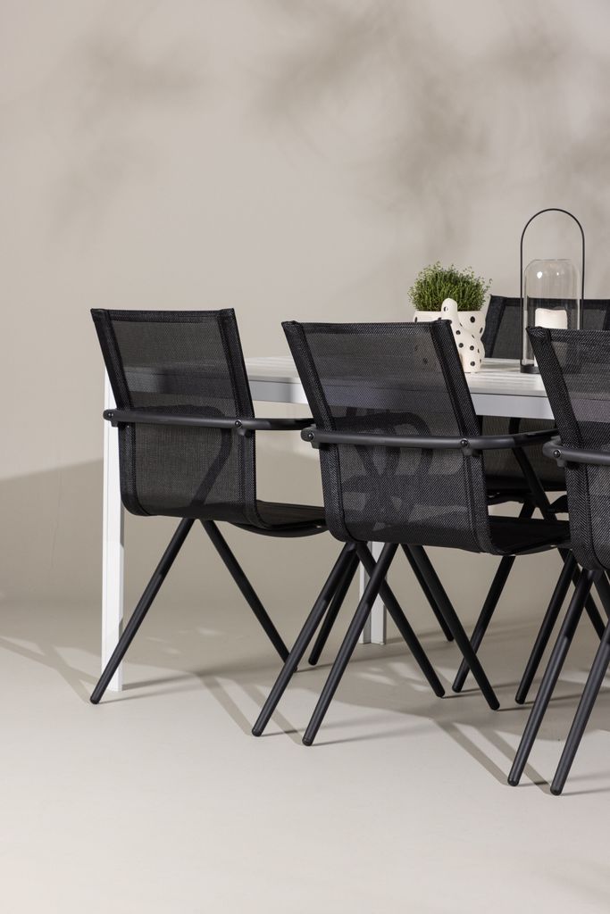 Alina stolarna har en sofistikerad svart design och är tillverkade med slitstark textilene sitts som garanterar komfort. Stolarnas robusta aluminiumstomme ger både stabilitet och en modern känsla som smälter in i din uteplats.