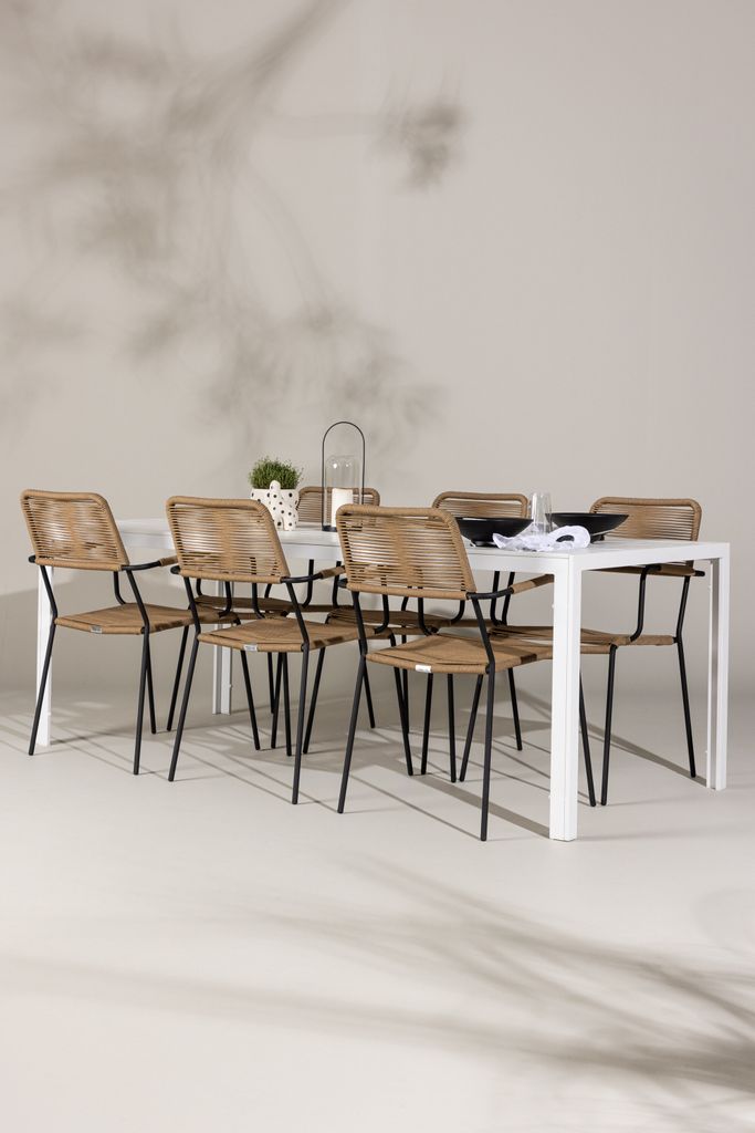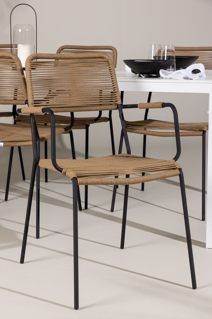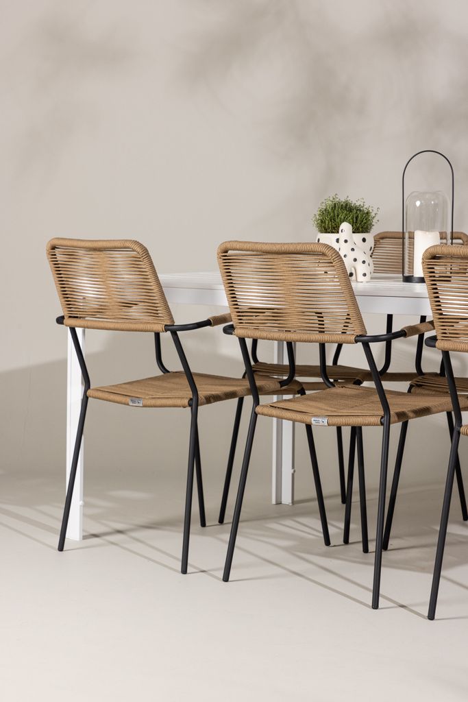 Lindos stolarna imponerar med sina bruna sitsar i slitstarkt repmaterial och svarta stålramar, vilket ger dem en rustik men modern känsla. Den naturliga designen smälter vackert in i vilken utomhusmiljö som helst.