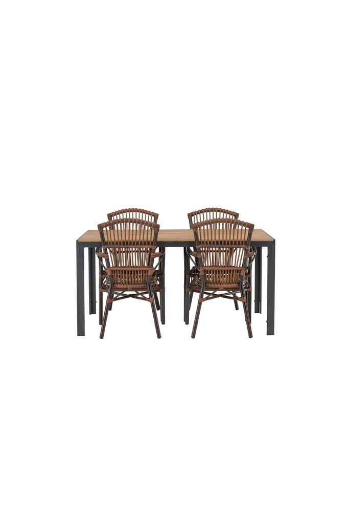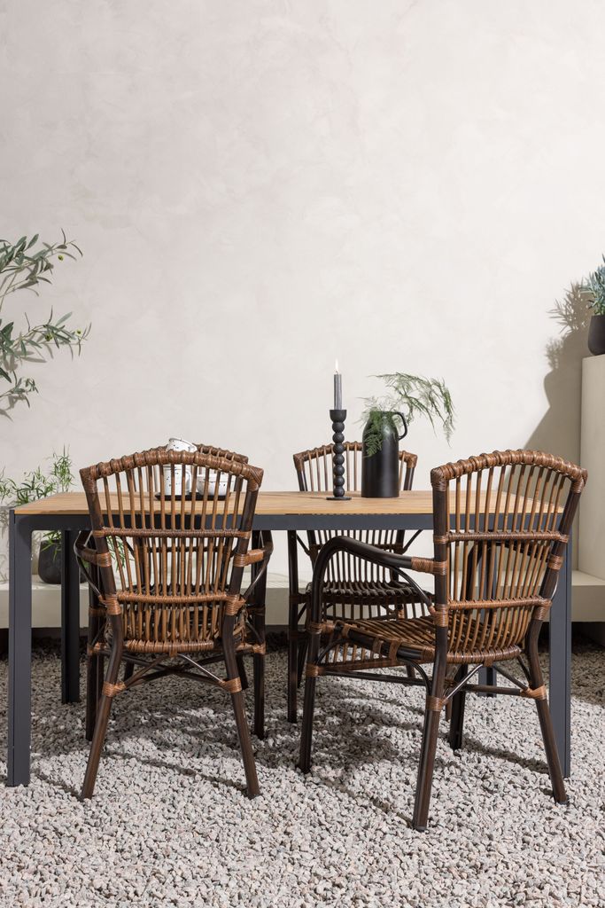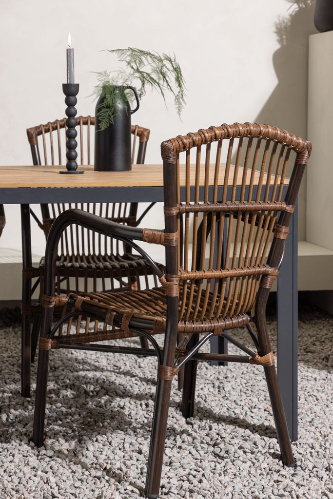 De fyra medföljande Galera-stolarna fortsätter det moderna temat med sin vackra valnötsfärg och flätade korgmaterial. Stolarna har en robust ram av aluminium och är utrustade med höga armstöd för bästa komfort. Det generösa sittdjupet gör det enkelt att sitta bekvämt under långa middagar.