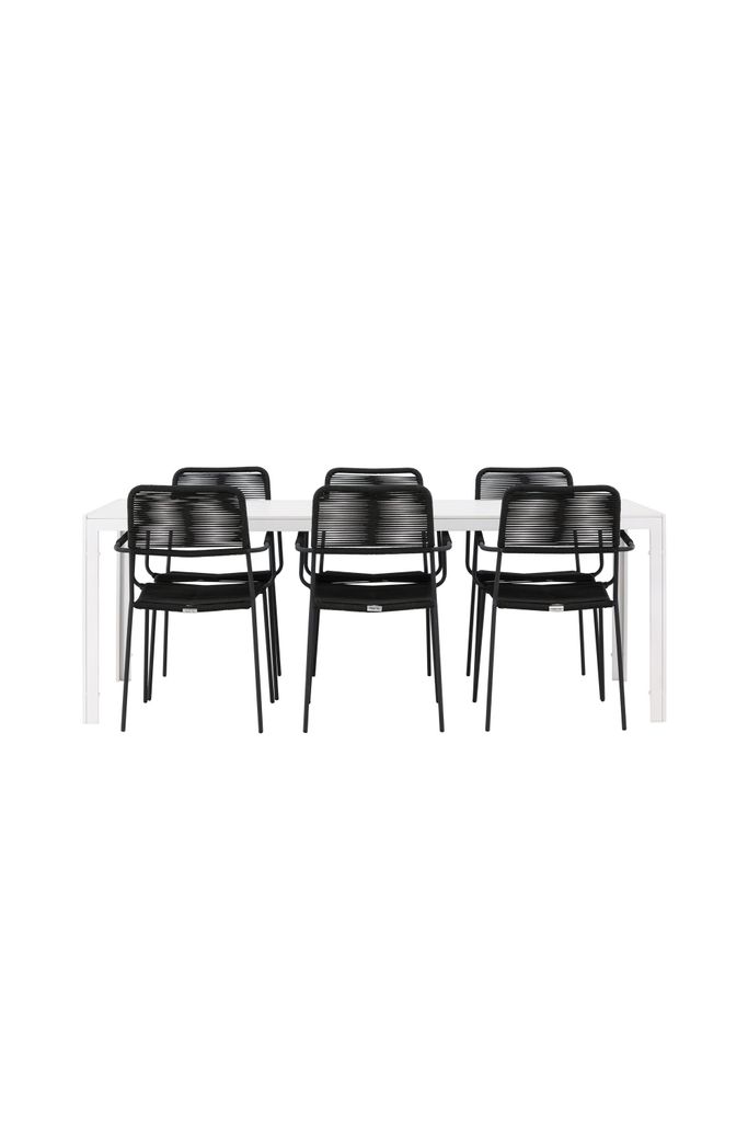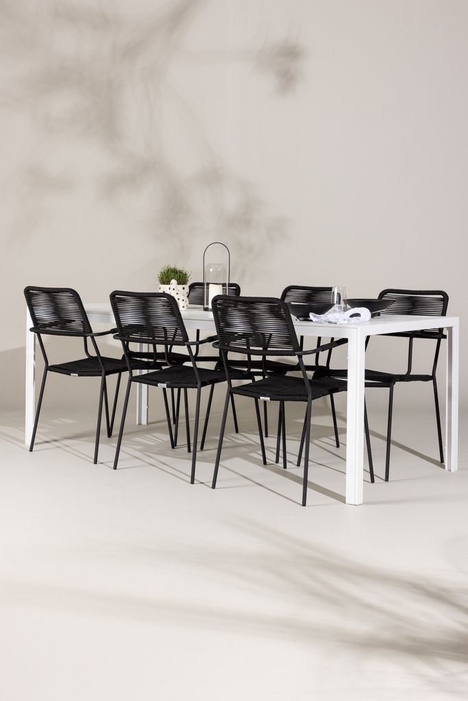 Stilfull utomhusmatgrupp med sex eleganta svarta Lindos stolar och ett vitt Break bord, perfekt för sociala sammankomster.