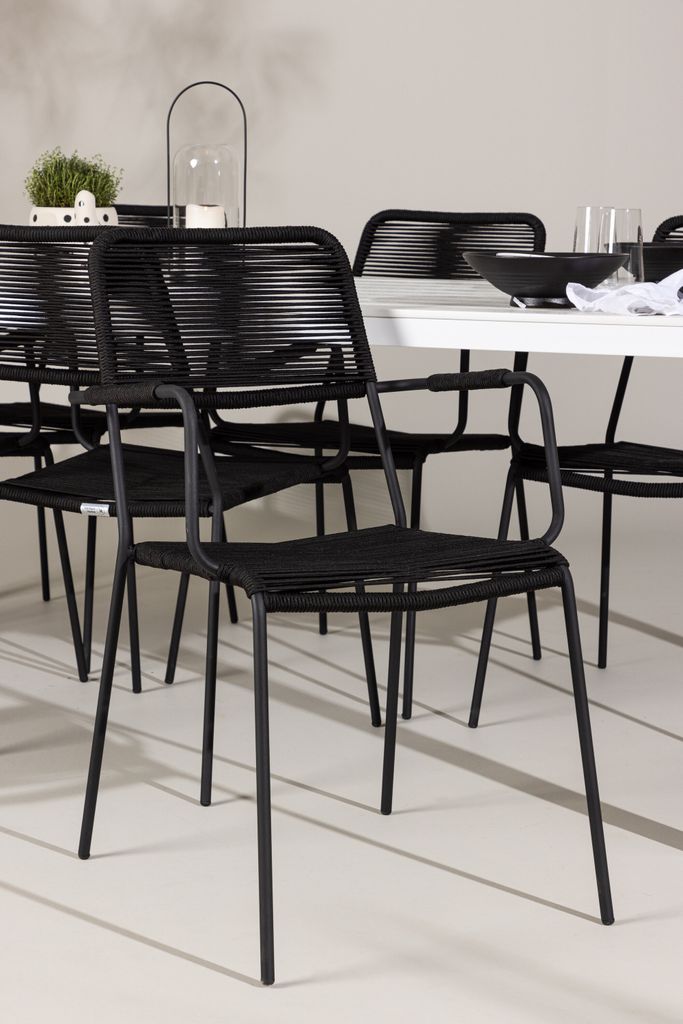 Lindos stolar är klassiskt svarta och tillverkade för att stå emot utomhusbruk. De är både eleganta och robusta, med sitsar av slitstarkt repmaterial och en stomme av stål som ger en perfekt balans mellan stil och komfort.