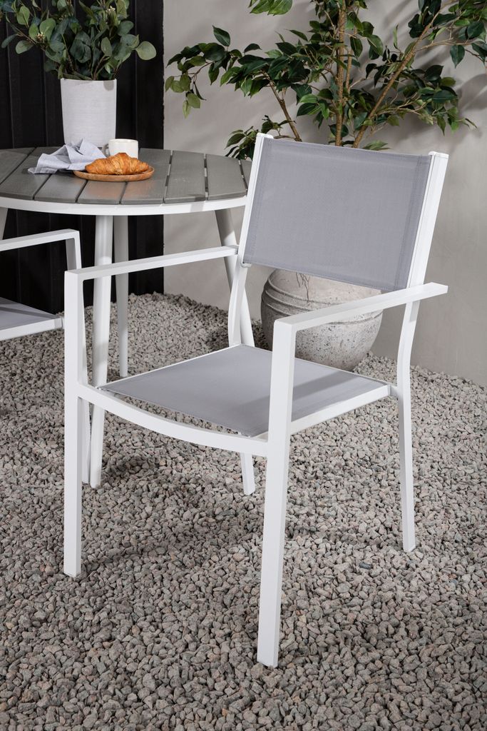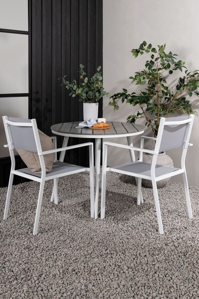 Inbjudande matgrupp med rund grå aintwood-skiva och vita aluminiumstolar för trivsamma sommarstunder.