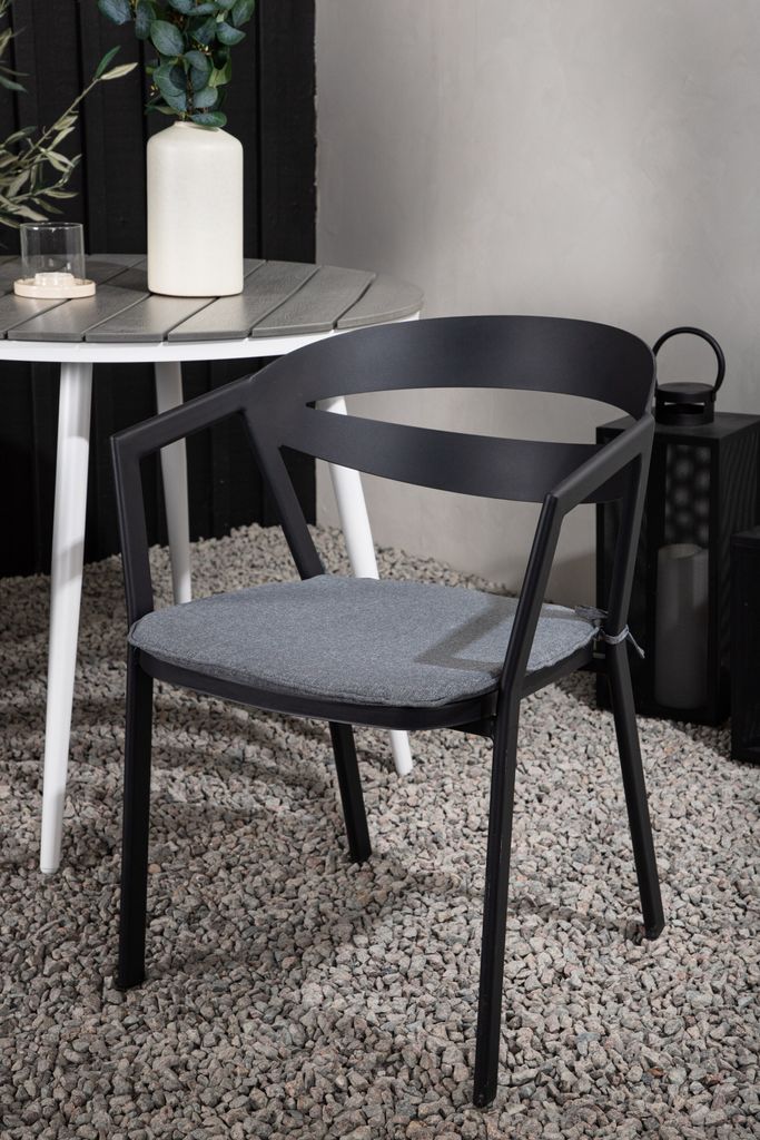 De medföljande Slit-stolarna är designade för både komfort och stil. Stolarna har en robust ram i svart aluminium och är utrustade med integrerade armstöd. De grå dynorna ger en extra nivå av komfort så att du kan njuta av långa, avslappnade måltider.