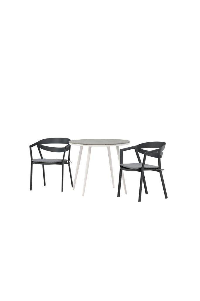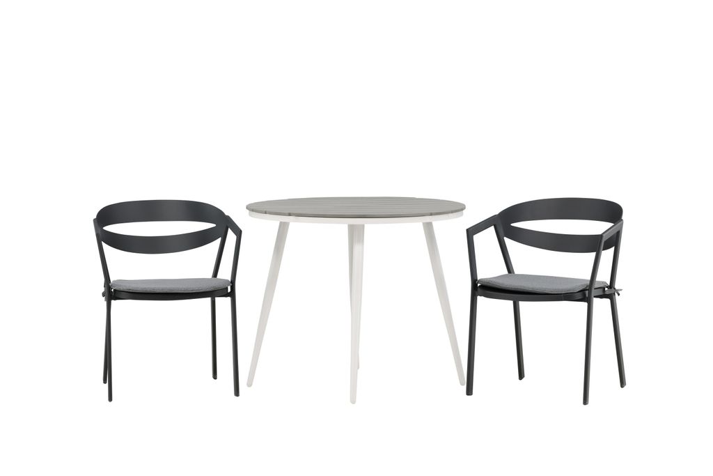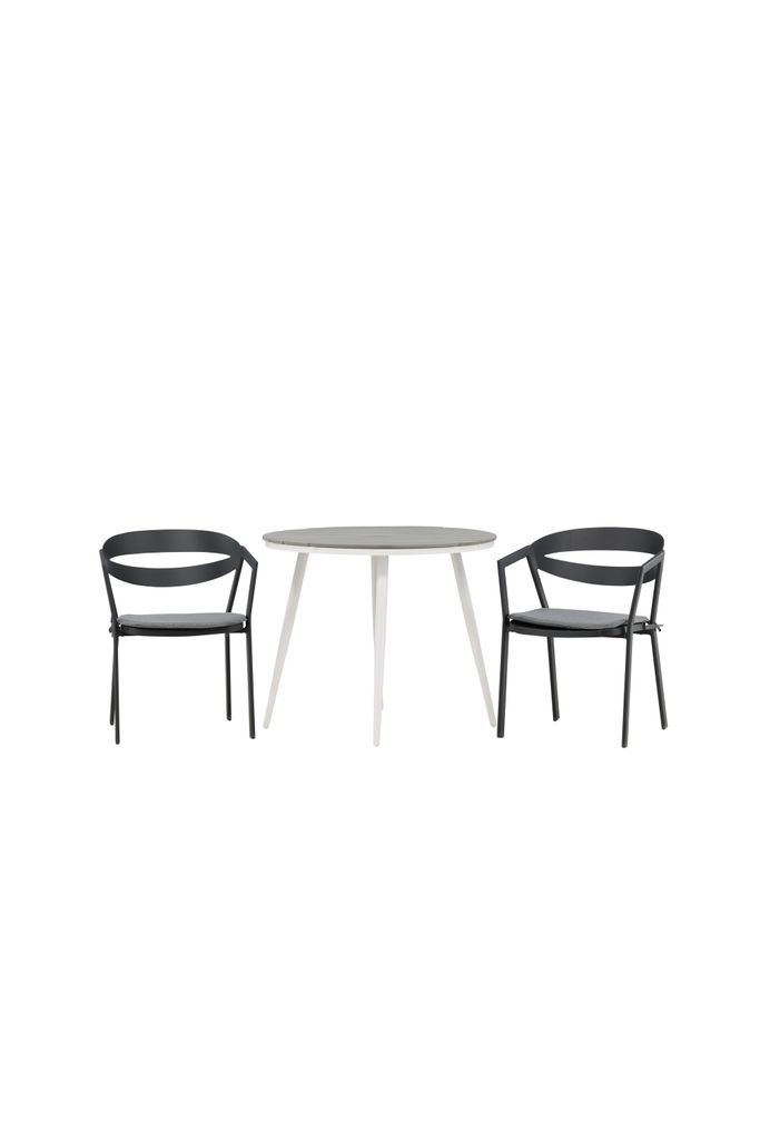 Inbjudande matgrupp för två med grå aintwood bordsskiva och vita aluminiumben. Slit-stolar med integrerade armstöd och grå dynor för komfort.