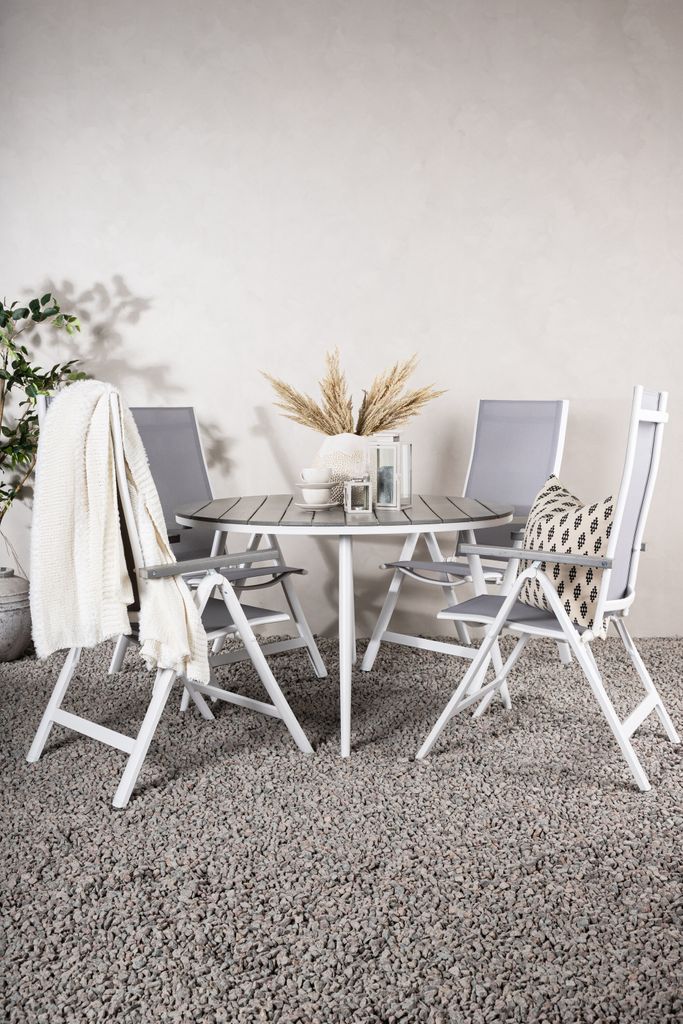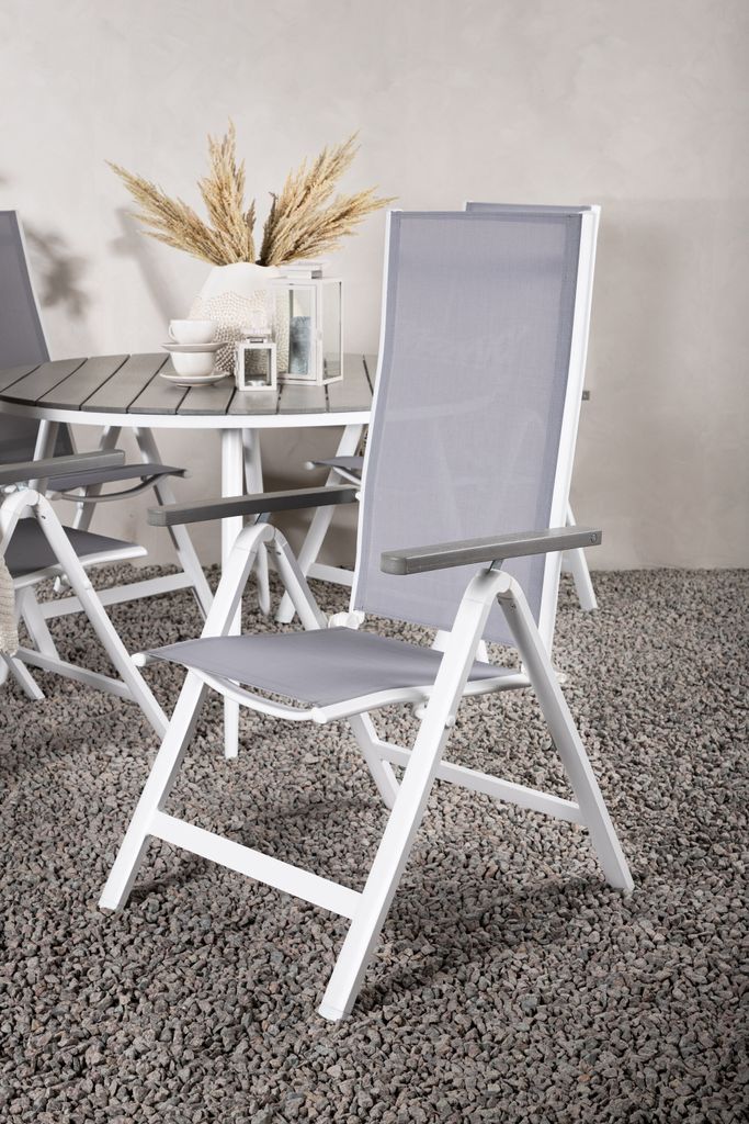 Tillsammans med bordet ingår fyra stolar från Albany-serien, kända för sin komfort och hållbarhet. Dessa fällbara 5-positionsstolar är tillverkade i grå textilene med vita aluminiumramar, vilket gör dem både stilrena och funktionella. De inbjudande armstöden och det justerbara ryggstödet säkerställer att du kan njuta av långa, avkopplande stunder utomhus.