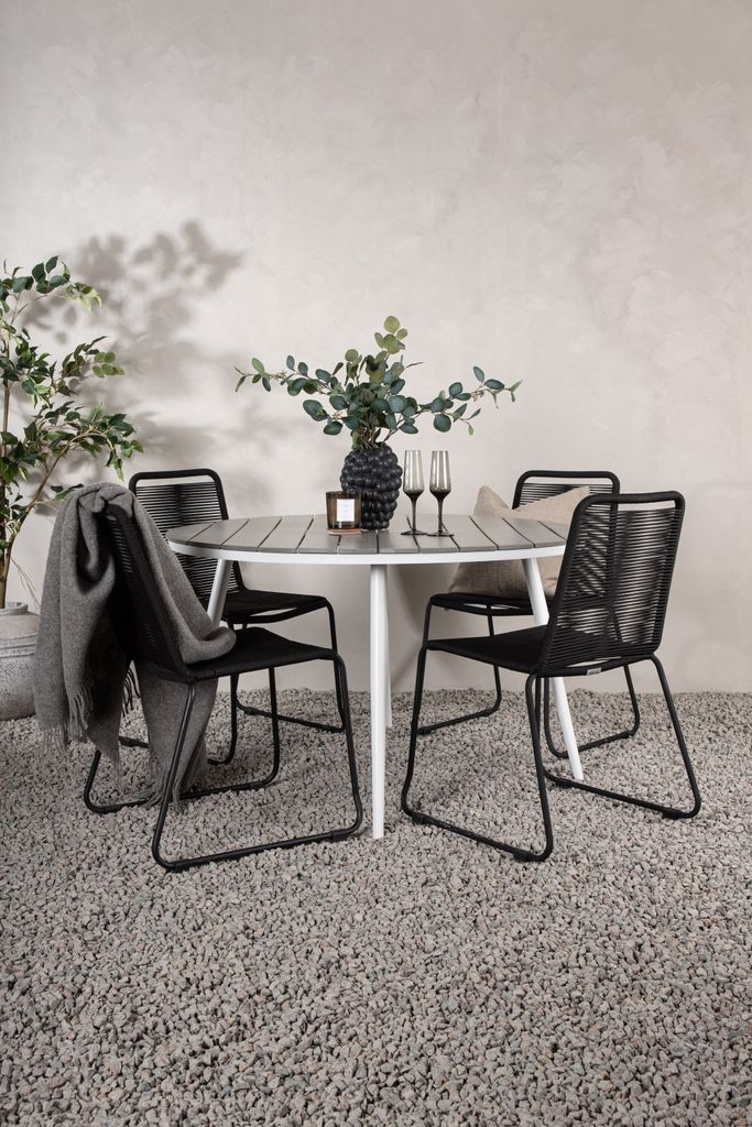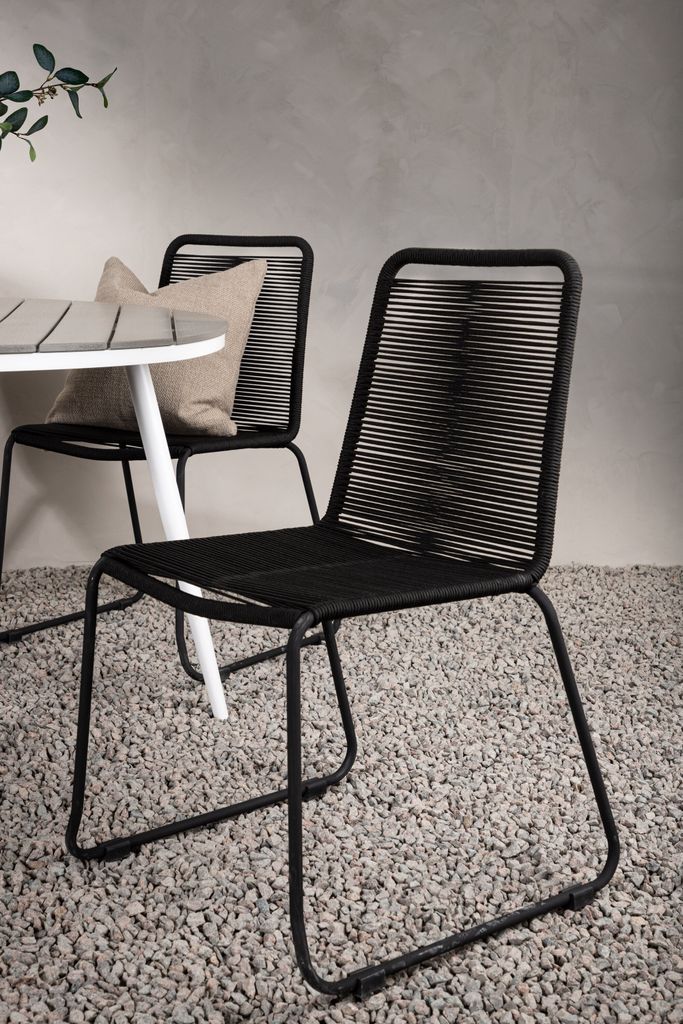 Matstolarna från serien Lindos är designade med smala ben i svart aluminium som bidrar till gruppens trendsäkra utseende. Sitsarna är gjorda av slitstarkt svart rep, vilket ger både komfort och en modern touch. Denna matgrupp är inte bara praktisk utan också ett blickfång som garanterat imponerar på dina gäster.