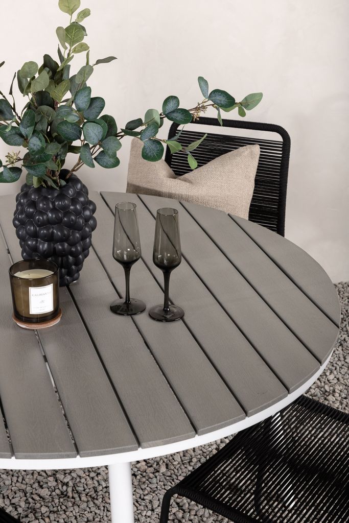 Elegant rund matgrupp med grått aintwood-bord och svart repsits. Perfekt för sociala tillfällen utomhus.