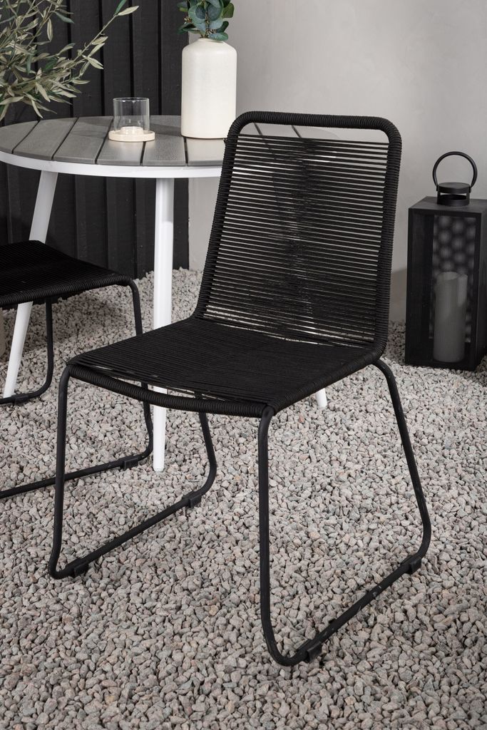 De smäckra stolarna från serien Lindos har svarta aluminiumben och en sits gjord av slitstarkt svart rep, vilket ger både stil och komfort. Dessutom kan stolarna staplas för enkel förvaring när de inte används.