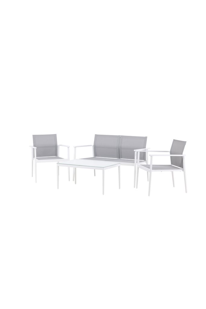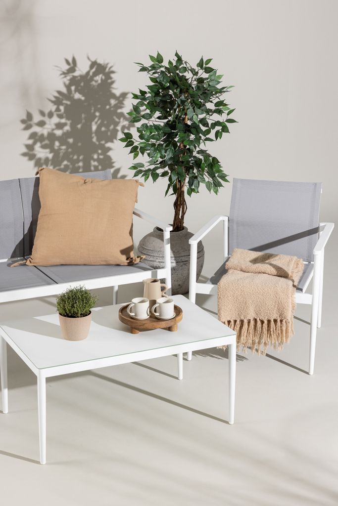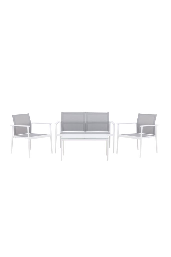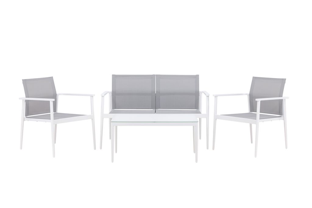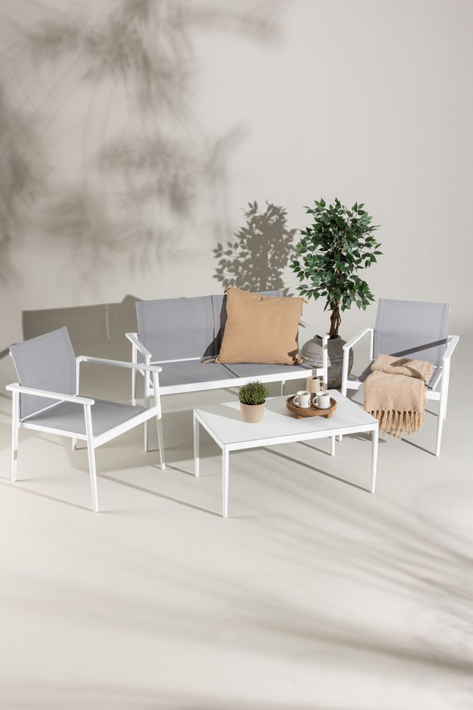 Skapa din favorithörna på uteplatsen med Venture Home Break Soffgrupp! Denna eleganta och stilrena soffgrupp är perfekt för dig som värdesätter både komfort och design. Den vita ramen är gjord av hållbart aluminium, vilket ger en stilren och modern nordisk känsla. Rygg och sits är tillverkade av grå textilene som erbjuder hög sittkomfort och är dessutom vattenresistent och UV-behandlat.