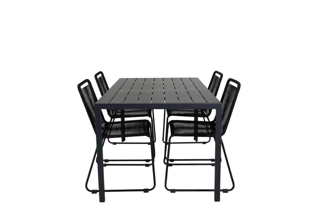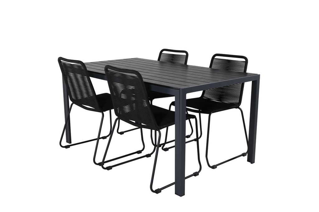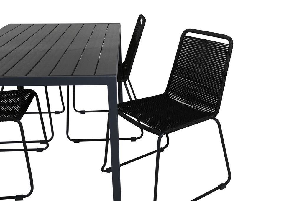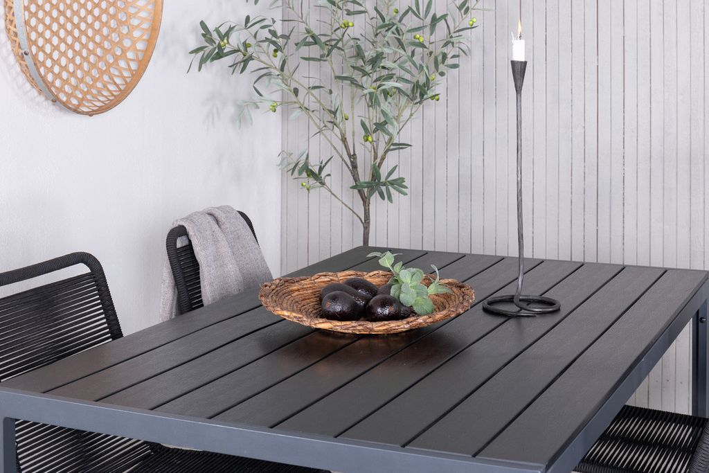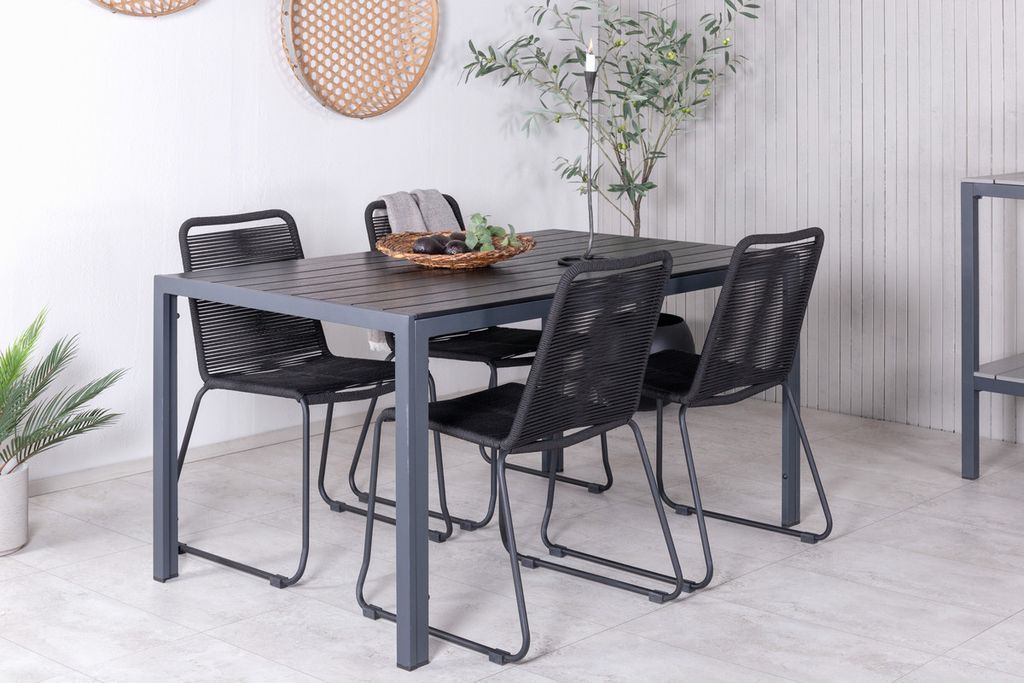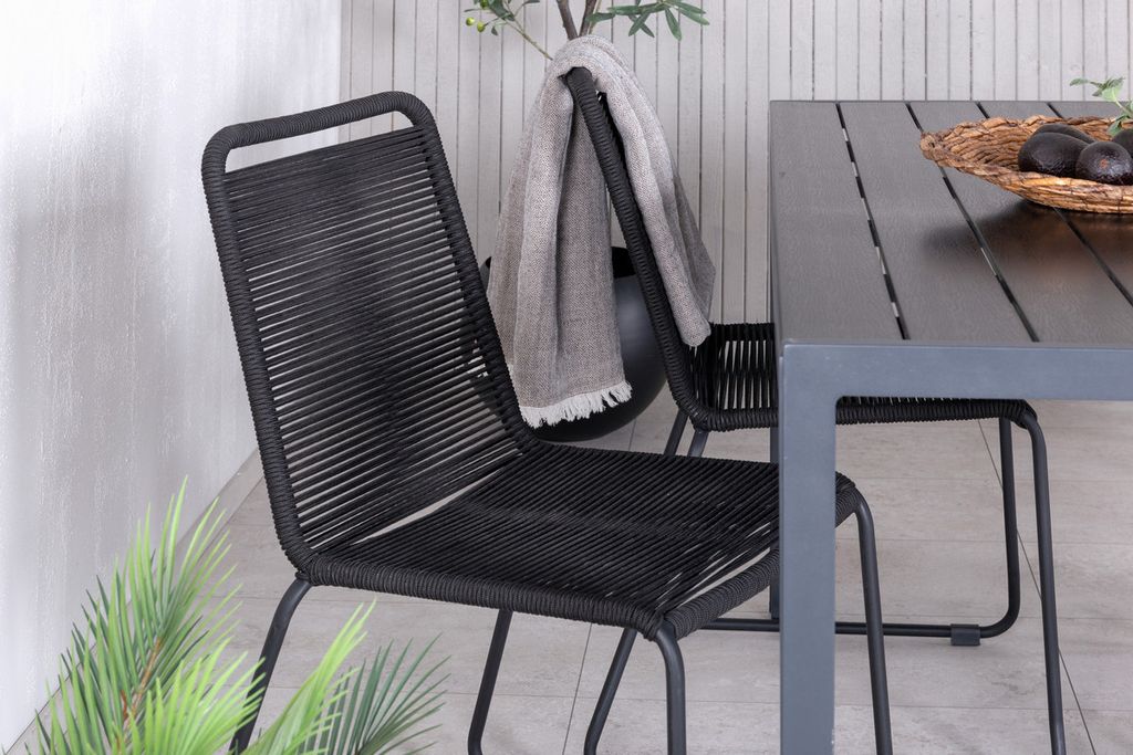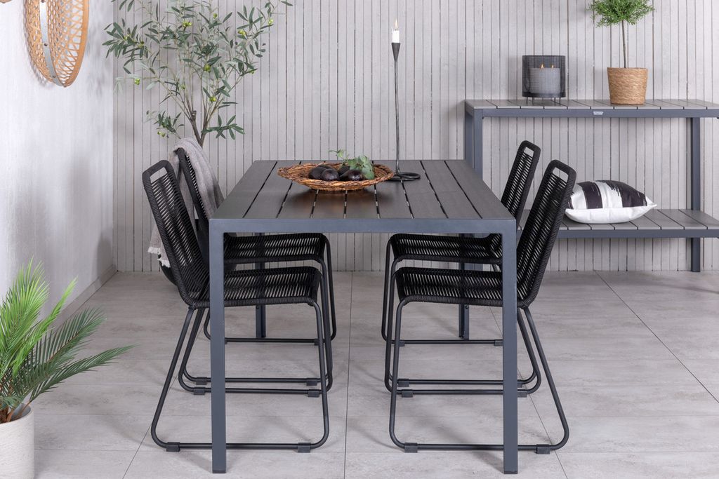 Skapa en stilren atmosfär i uterummet med en iögonfallande matgrupp i modern anda! Våra omtyckta matstolar Lindos sätter verkligen tonen med sin minimalistiska design. Stolarna är stapelbara för praktisk förvaring och tillverkade i en smal, svart aluminiumkonstruktion med en sits i svart vävt rep. Här tillsammans med vårt rektangulära matbord Break i rak nordisk form. Bordsskivan är i svart plywood och underredet i aluminium. Helt enkelt en genomtänkt matgrupp som du enkelt skapar charmiga utomhusmiljöer med!
