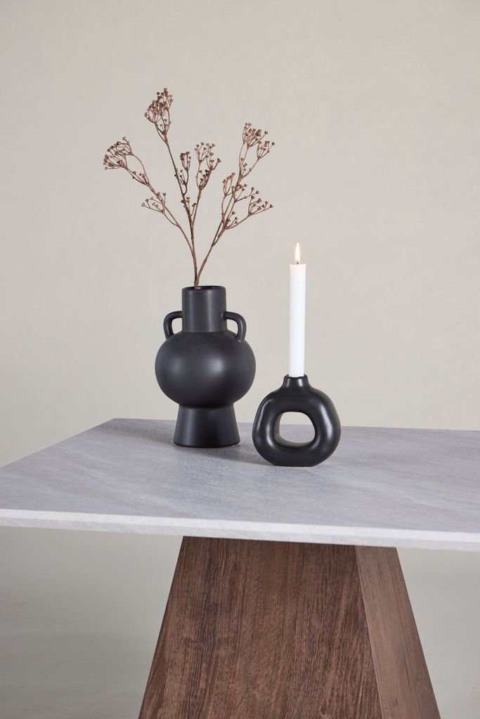 Det stabila bordsbenet i MDF-material är utformat för att ge en luftig känsla samtidigt som det erbjuder pålitligt stöd. Kombinationen av de ljusa och mörka tonerna gör bordet perfekt för både minimalistiska och inredda vardagsrum.