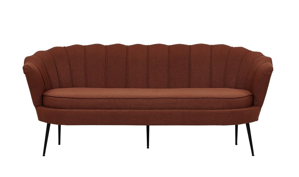 Elegant 3-sits soffa med snäckformad rygg och smala metallben. Rödfärgat polyestertyg erbjuder hög komfort och modern stil.