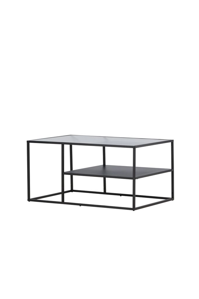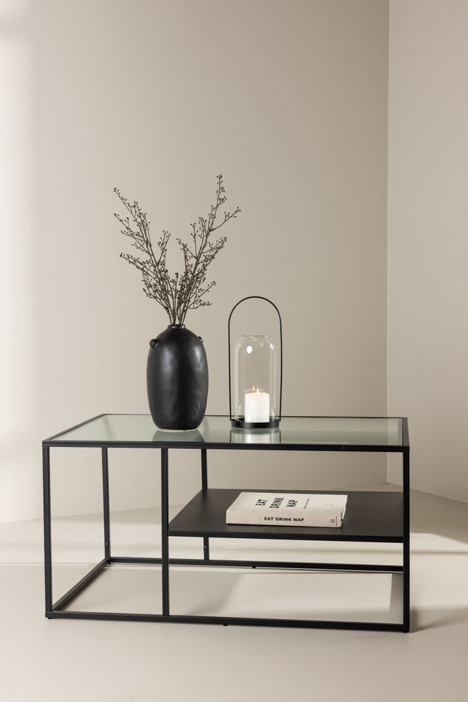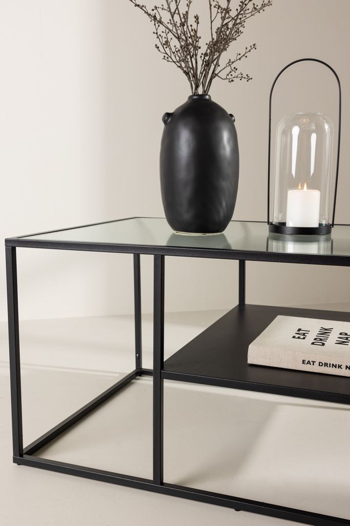 Elegant och funktionellt soffbord i svart stål med glasbordsskiva och extra hyllplan. Perfekt för ditt vardagsrum.