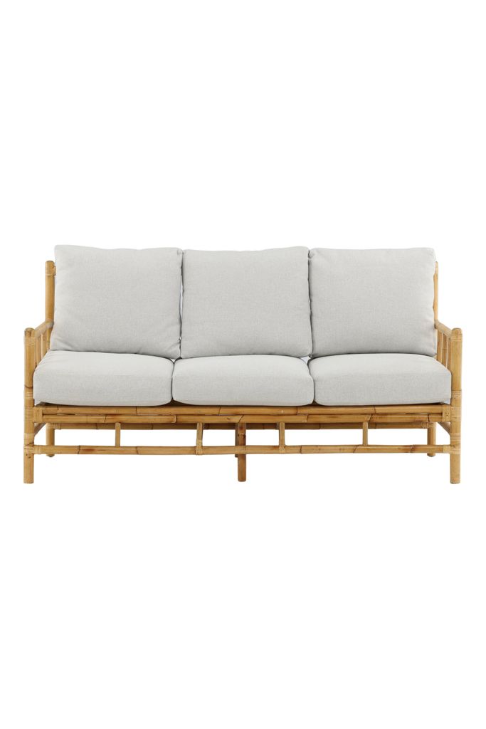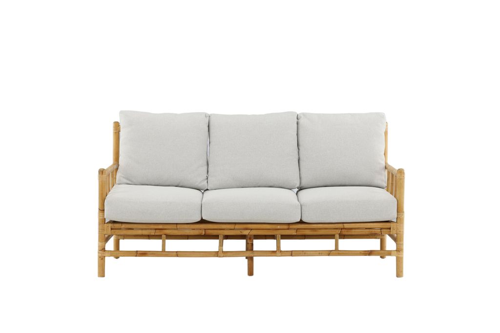 Eleganta Cane 3-sitssoffa i naturfärgad bambu med vita dynor för en tropisk och inbjudande känsla.