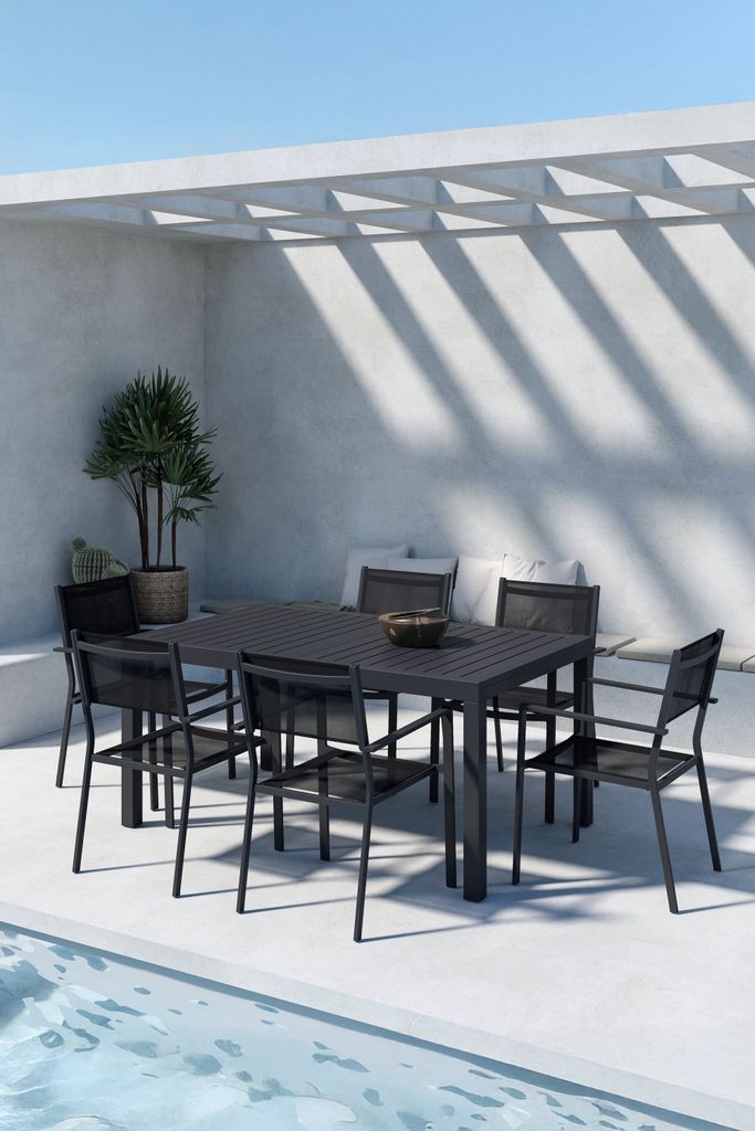 Elegant och modern utomhusmatgrupp i helsvart aluminium, idealisk för både vardag och fest.