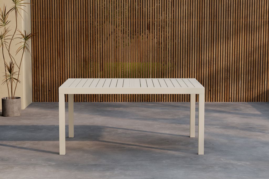 Elegant matbord i beige aluminium, perfekt för utomhusmiljöer. Förlängningsbart och stabilt för sociala tillfällen.