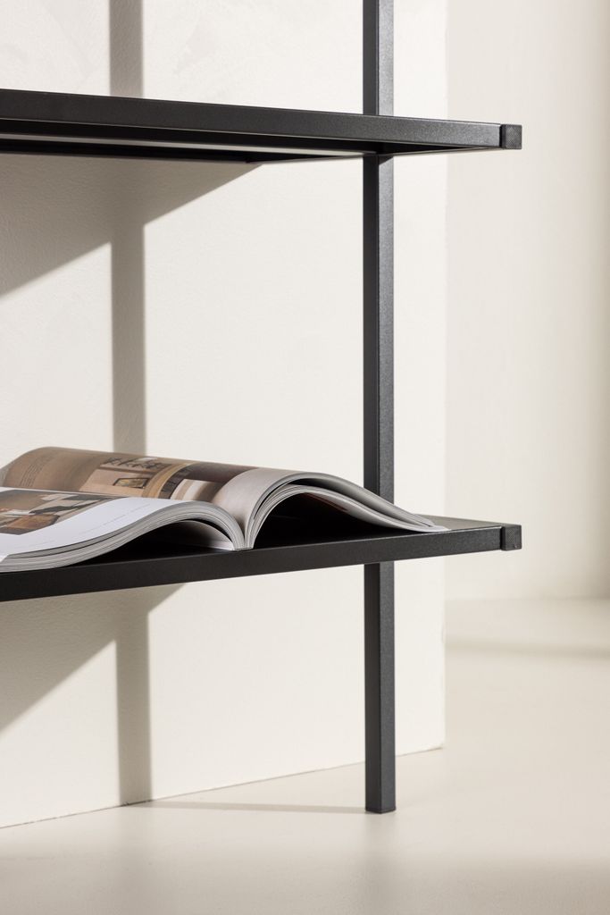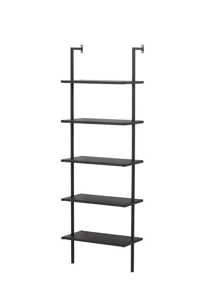 Stilren hylla i svart stål med fem hyllplan – perfekt för att organisera och visa upp dina favoriter.