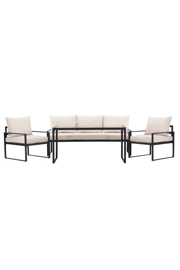Catania soffgrupp förvandlar uteplatsen till en stilren oas med svart stålram och beige dynor för modern komfort.