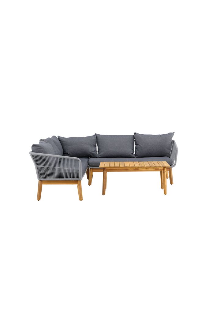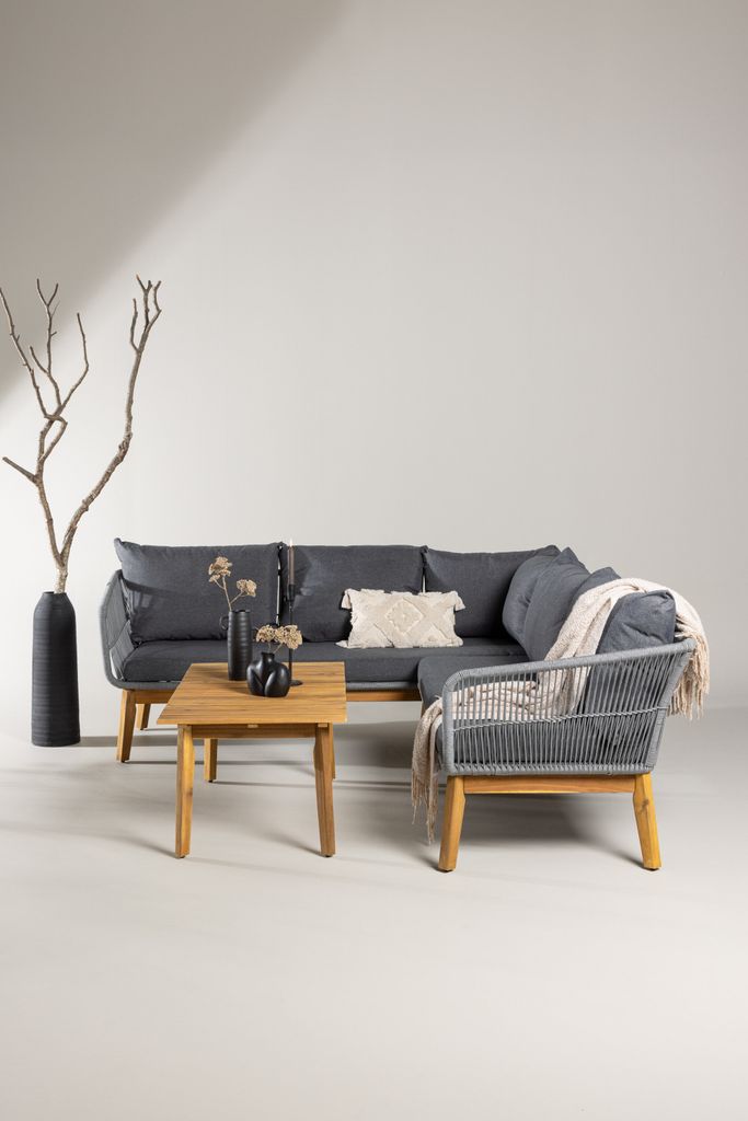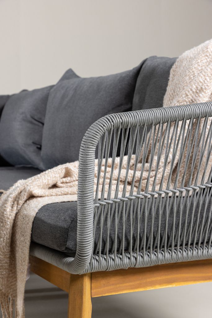 Chania – Modern hörnsoffgrupp i ljusgrått rep och akacia, med bekväma mörkgrå dynor och stilrent soffbord.