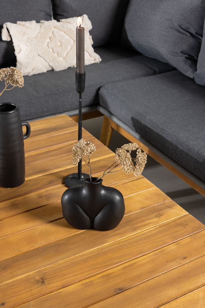 Det medföljande soffbordet i akacia kompletterar soffgruppen och skapar en sammanhängande och exklusiv helhet. För att säkerställa hållbarhet och bevara träets vackra finish rekommenderas regelbunden oljebehandling av akaciaträet.
