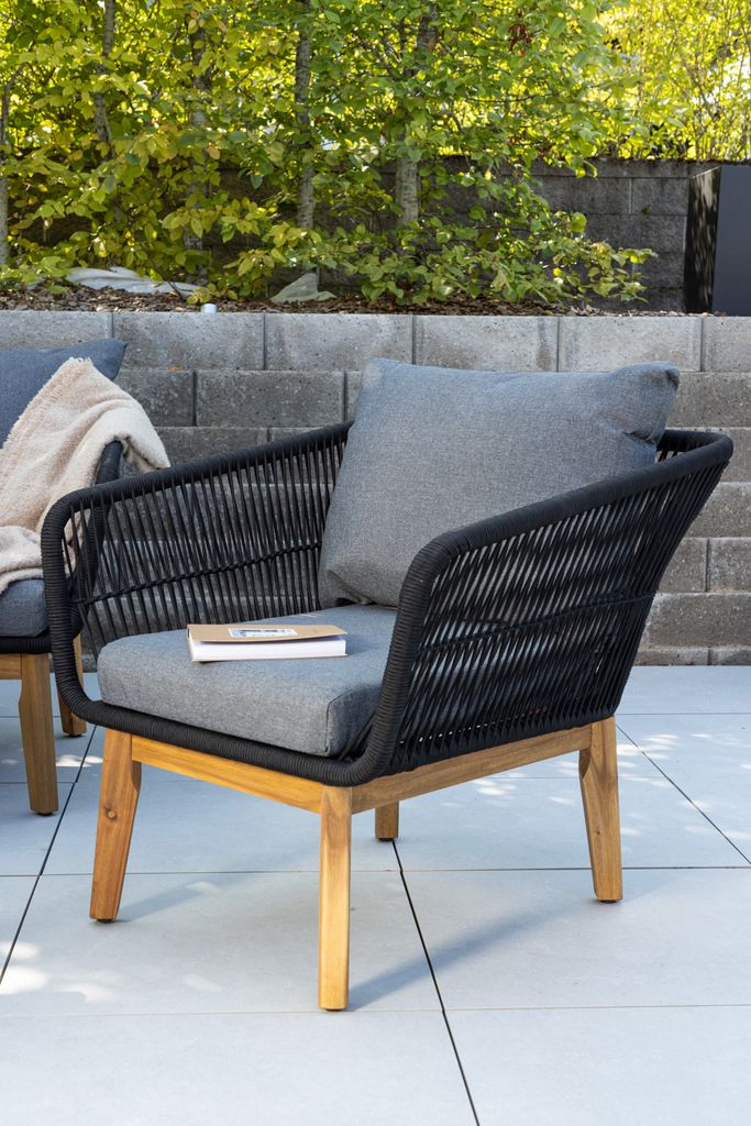 Med en stomme i aluminium och ben i vacker akacia, ger denna grupp en robust och elegant känsla. Rygg och sidor är smakfullt flätade med svart rep vilket bidrar till en lyxig och modern estetik. Det låga soffbordet, genomgående tillverkat i akacia, kompletterar helheten och skapar en sofistikerad utomhusmiljö.
