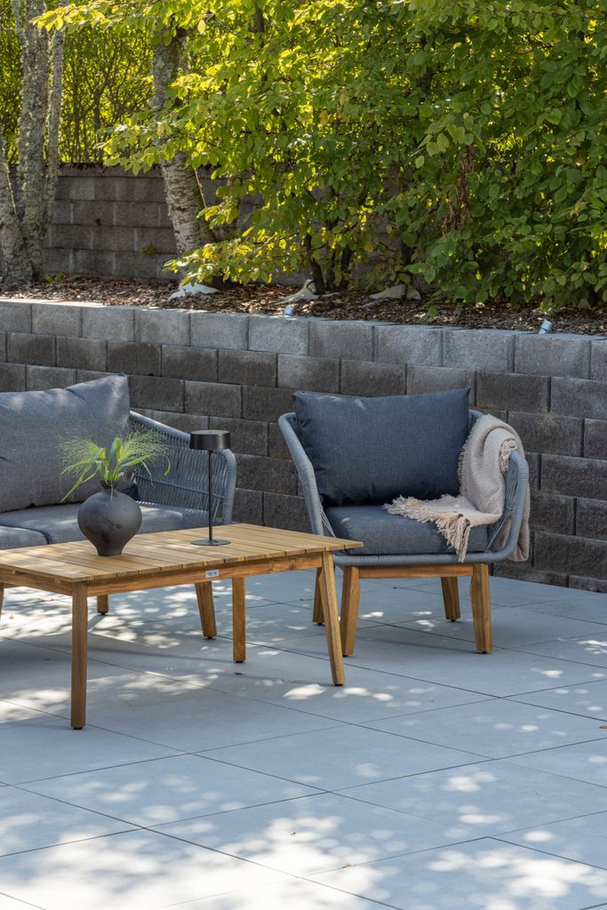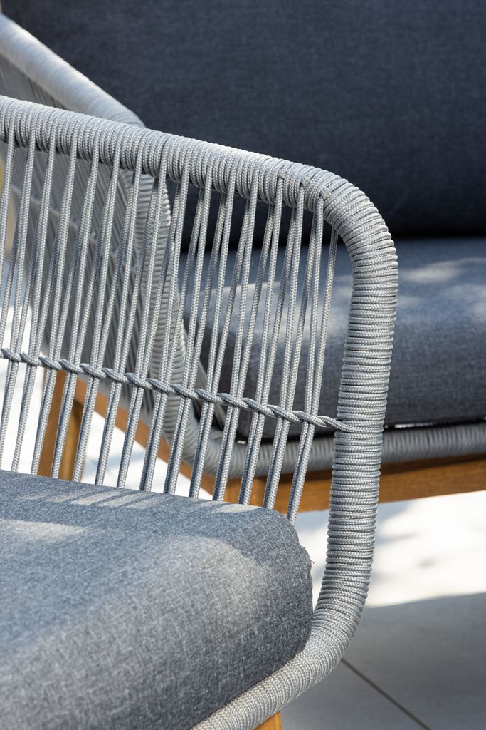 Soffgruppen har en stomme i aluminium och ben i acacia, vilket ger en robust och hållbar struktur. Rygg och sidor är konstfullt flätade i ett ljusgrått rep, vilket tillför en modern och stilren touch. De tjocka mörkgrå dynorna är både slitstarka och bekväma, vilket gör detta till ett utmärkt val för långa, avkopplande stunder utomhus.