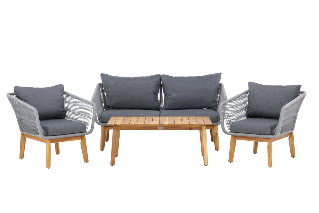 Chania - en trendig soffgrupp med fokus på bekvämlighet och iögonfallande design. Soffgruppen består av en tvåsits soffa, två karmfåtöljer inklusive tjocka slitstarka mörkgrå dynor. Till soffan ingår även ett lågt soffbord tillverkat helt i vacker acacia. Soffgruppen är tillverkad med en stomme i aluminium och ben i acacia samt är rygg och sidor flätade i ett ljusgrått rep som ger en stilren design. Soffgruppens detaljer i acacia tillsammans med soffbordet klassiska utformning skapar en exklusiv helhetskänsla.