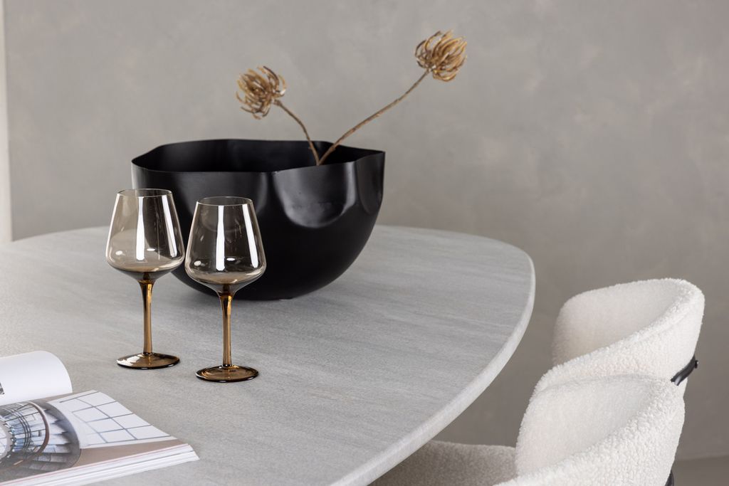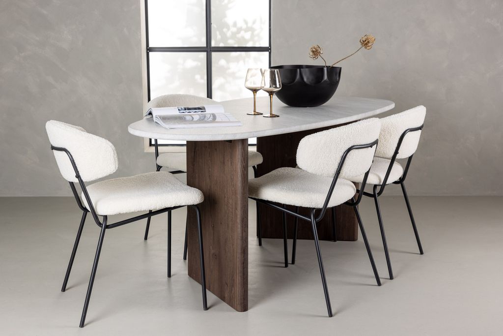 Tillsammans med de vita matstolarna från Chico-serien blir matgruppen komplett och skapar en perfekt harmoni. Stolens stilrena minimalism smälter samman med den rundade formen och det smäckra boucletyget i en vacker beige färg. Med stoppade sitsar och ryggstöd erbjuder stolen extra komfort och låter dig njuta av långa och härliga måltider. Möblera medvetet med en pampig och unik matgrupp som kommer bli din bästa vän till alla framtida måltider med familj och vänner!